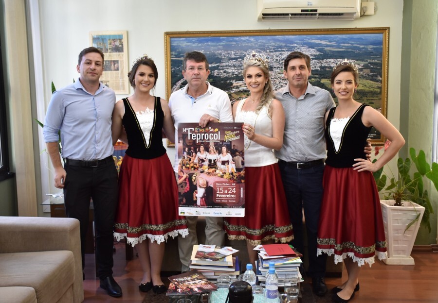 Nesta quinta-feira, dia 31 de janeiro, o Prefeito Municipal Waldemar de Carli recebeu em seu gabinete a Corte da 14ª Feprocol, festa de produtos coloniais. A Rainha Julia Menegat, juntamente com as Princesas Andrezza Piroli Tonello e Renata Zampieri convidam a todos os veranenses para que visitem a festa, que acontece de 15 a 24 de fevereiro, na cidade de Nova Pádua. Criada em 1983, a festa é o principal evento do município e representa os setores agrícola e industrial. O centro da cidade é o palco desta grande festa. Durante os dias do evento é possível viver as experiências proporcionadas pelas inúmeras atrações e pelos seus simpáticos habitantes. Viva essa experiência. Visite a 14ª Feprocol. em Foto: Caroline Cesca/em