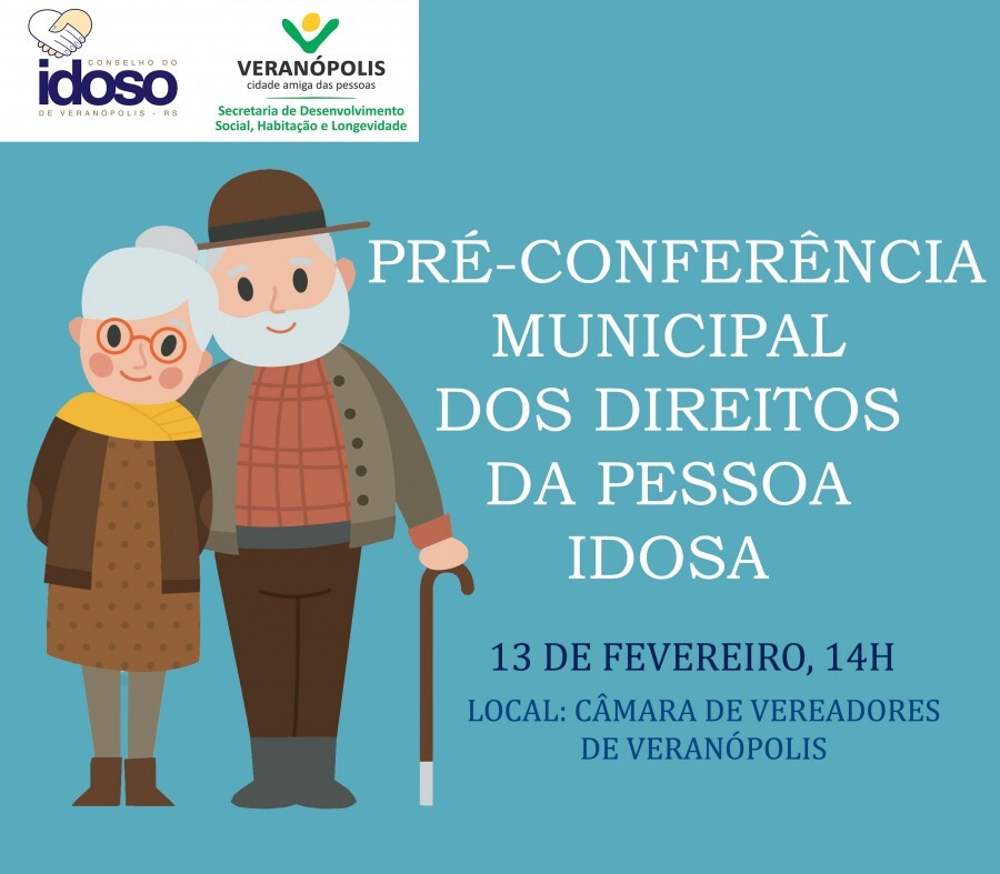 No próximo dia 13 de fevereiro, quarta-feira, às 14 horas, acontece a Pré-Conferência Municipal dos Direitos da Pessoa Idosa, que será realizado na Câmara de Vereadores de Veranópolis. Esta ação é organizada pela Secretaria de Desenvolvimento Social, Habitação e Longevidade e Conselho Municipal do Idoso. Todos estão convidados a participar!