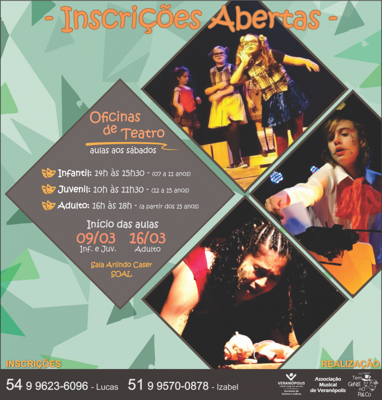 A Cia Teatral Tem Gente no Palco de Veranópolis, convida a todos para aprimorarem seus talentos, participando das Oficinas de Teatro oferecidas em 2019. As aulas serão oferecidas de forma gratuita pela Prefeitura, através da Associação Musical e da Secretaria de Turismo e Cultura. A Cia iniciou suas atividades em 2012 e produz suas próprias montagens teatrais, com base em pesquisas e laboratórios. Em 2018 participou, com seus grupos infantil e juvenil, do Festival de Teatro da cidade de Viamão e trouxe para casa muitas experiências e, também, algumas indicações e premiações. Além disso, com o grupo adulto, circulou com seus trabalhos pelas cidades de Arroio dos Ratos – no FESCARBO, Festival de Teatro da Região Carbonífera, trazendo indicações e premiação de melhor cenografia -, Nova Araçá, André da Rocha, Veranópolis e Porto Alegre com diversas apresentações ao longo do ano. Quer saber como se inscrever? É fácil! As indicações abaixo mostram as turmas, os dias e horários das aulas: · Infantil (7* a 11 anos): Sábados, das 14h às 15h30min · Juvenil (12 a 15 anos): Sábados, das 10h às 11h30min · Adulto (a partir dos 15 anos): Sábados, das 16h às 18h * Crianças de 6 anos de idade também podem experimentar a vivência, mediante adaptação, visando que a faixa etária dos alunos pode ser flexível, já que cada aluno é avaliado individualmente. Escolha a sua turma e entre em contato através do WhatsApp ou pela Fanpage: · Prof. Lucas Nunes: (54) 9 9623-6096 · Fanpage: www.facebook.com./ciatemgentenopalco As aulas iniciam em março (Infantil e Juvenil – 09/03 | Adulto – 16/03), na sala de pequenos eventos: Arlindo Caser (subsolo da SOAL). Venha participar e desenvolver seus talentos e habilidades.