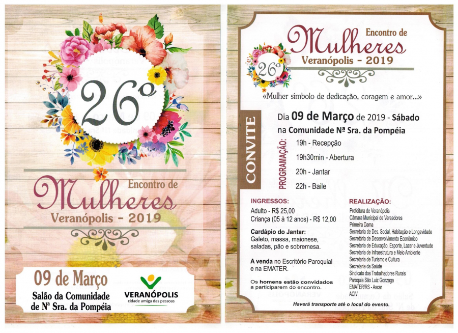 No sábado, dia 09 de março, acontece o 26º Encontro de Mulheres de Veranópolis. O tradicional evento realizado em comemoração ao Dia da Mulher acontece neste ano na comunidade de Nossa Senhora da Pompéia. A programação inicia às 19 horas com recepção. Às 19h30min haverá a abertura oficial e após será servido o jantar. A animação da noite fica garantida com o baile. Os ingressos já estão à venda no Escritório Paroquial e na Emater, no valor de R$25 adulto e R$12 para crianças (de 5 à 12 anos). As mulheres moradoras das comunidades do município foram convidadas diretamente pela Emater. Lembrando que será disponibilizado transporte das demais localidades até o evento. O 26º Encontro de Mulheres de Veranópolis é uma realização da Prefeitura de Veranópolis, Câmara de Vereadores, Primeira Dama, Secretarias Municipais de Desenvolvimento Social, Habitação e Longevidade, de Desenvolvimento Econômico, de Educação, Esporte, Lazer e Juventude, de Infraestrutura e Meio Ambiente, de Turismo e Cultura, de Saúde, do Sindicato dos Trabalhadores Rurais, da Paróquia São Luiz Gonzaga, Emater/Ascar e Aciv. Todas as mulheres da Terra da Longevidade estão convidadas a participarem. Homens também serão bem vindos. "Mulher símbolo de dedicação, coragem e amor."