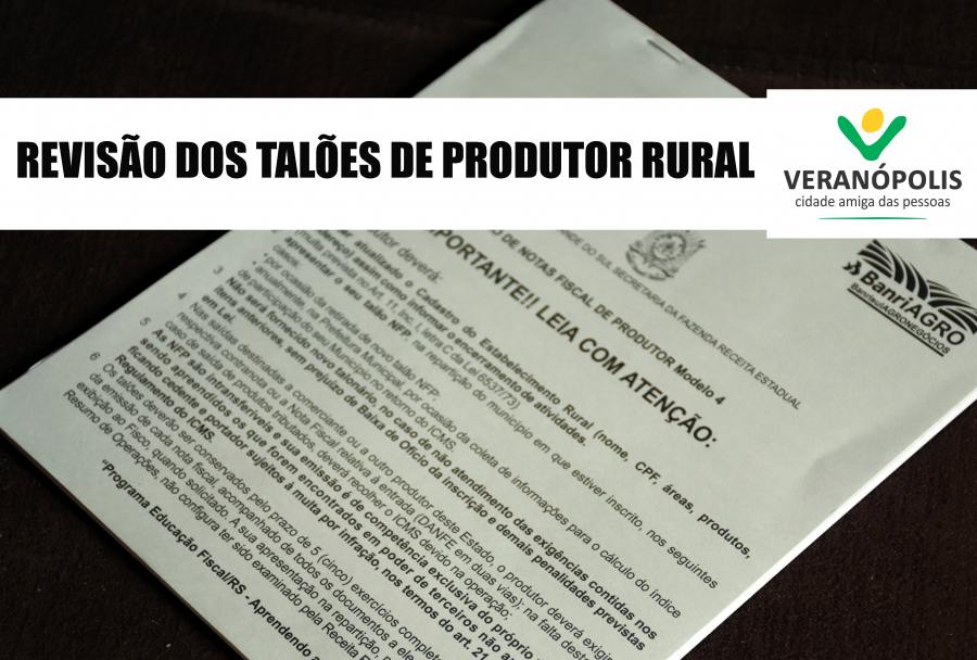A Secretaria Municipal de Finanças de Veranópolis avisa que amanhã é o úLTIMO DIA que estará recebendo os detentores de talão de produtor rural, para apuração da movimentação relativa ao ano de 2018. Para validar a apresentação é necessário observar o acompanhamento da contra nota mediante as notas emitidas. O comparecimento de todos os possuidores de talão de produtor rural é OBRIGATÓRIO, pois essa apresentação compõe uma das principais variáveis na formulação do índice de retorno do ICMS para o município. Os que não apresentarem estarão sujeitos a penalidades que vão desde multas até o cancelamento da inscrição. Maiores informações podem ser obtidas na Secretaria de Finanças, no Centro Administrativo Municipal, ou pelo telefone 3441-1477, ramal 2035