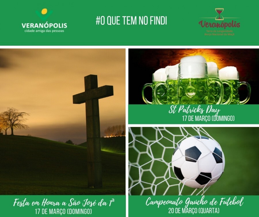 strong Confira a programação do final de semana em Veranópolis! Quinta 14/03 - Campeonato municipal de Futsal - às 19h30min, no Ginásio Poliesportivo Leonir Antônio Farina. VERONA X FC 51 / PLANALTO X ARMAÇÃO / LET´S GO X SERRANO. Informações: Secretaria de Esportes - (54) 3441 1844 Sexta 15/03 - Campeonato municipal de Futsal - às 19h30min, no Ginásio Poliesportivo Leonir Antônio Farina. UNIÃO C. X PJB IPIRANGA / HALIANÇA X AAV / SANTA CLARA X SERRANO / JUVENTUS X BARCELONA. Informações: Secretaria de Esportes - (54) 3441 1844 - Acústico Especial St. Patrick’s Day - abertura do bar às 18h30min, o Zeppelin rock bar, Av. Pinheiro Machado, 770 (térreo da Soal). Informações: (54) 99984-4360 Sábado 16/03 - Golden Night Parte 4 - às 23h, no Clube dos Motoristas de Veranópolis. Informações: (54) 3441 1412. Domingo 17/03 - St Patrick’s Day - das 12h às 22h, no Aeroclube de Veranópolis, Rua Alameda Santos Dumont. Comida Típica Irlandesa, Chopp Verde, Telão para o Grenal, Cerveja Artesanal, Espaço Kids, entre outros atrativos. Informações: Altenberg (54) 99154-8439. - Festa em Honra a São José da 1º - a partir das 10h45min, na Comunidade de São José da 1ª. Início com Missa Festiva e Almoço com Buffet. Cardápio: churrasco de gado, galeto, massa, maionese, canudos, pastéis, saladas diversas, pão e café. Após, Reunião Dançante com Os Seresteiros do Baile. Informações e ingressos: (54) 3441 1604 E na outra semana: Terça 19/03 - Campeonato municipal de Futsal - às 19h30min, no Ginásio Poliesportivo Leonir Antônio Farina. ARMAÇÃO X HALIANÇA / SANTA CLARA X PLANALTO / INDEPENDENTE X JUVENTUS. Informações: Secretaria de Esportes - (54) 3441 1844 Quarta 20/03 - Campeonato Gaúcho de Futebol 2019 - VEC x Brasil de Pelotas, no Estádio Antônio David Farina. Informações e ingressos: VEC (54) 3441-4878 Quinta 21/03 - Campeonato municipal de Futsal - às 19h30min, no Ginásio Poliesportivo Leonir Antônio Farina. IPIRANGA X PLANALTO / SERRANO X VERONA / HALIANÇA X LET´S GO. Informações: Secretaria de Esportes - (54) 3441 1844 Diariamente - Casa Saretta - Centro de Atenção ao Turista BR 470, km 177, nº 2201. Informações: (54) 3441 5953 Segunda a sexta-feira das 8h30min às 17h Sábados e Domingos das 10h às 16h - Casa Saretta Artesanato BR 470, km 177, nº 2201. Informações: (54) 3441 7695 Segunda a sexta-feira das 8h30min às 11h30min e das 13h30min às 17h Sábados e Domingos das 10h às 16h De segunda a sexta-feira - Biblioteca Pública Mansueto Bernardi Av. Pinheiro Machado, 770 - centro (hall de entrada da SOAL). Informações: (54) 3441-3441-7615 Segunda a sexta-feira das 8h30min às 17h Toda Quarta e Sábado - Feira Ecológica com agricultores de Veranópolis, no caramanchão ao lado do Salão N.S. de Lourdes: Quartas-feiras das 12h30min às 16 horas / Sábados das 7 às 12 horas Informações Secretaria de Desenvolvimento Econômico: 3441-1477