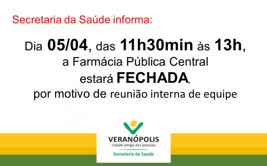 A Secretaria da Saúde de Veranópolis informa que na próxima sexta-feira, dia 05 de abril, a Farmácia Pública estará fechada no horário das 11h30min às 13 horas, devido a reunião interna da equipe.