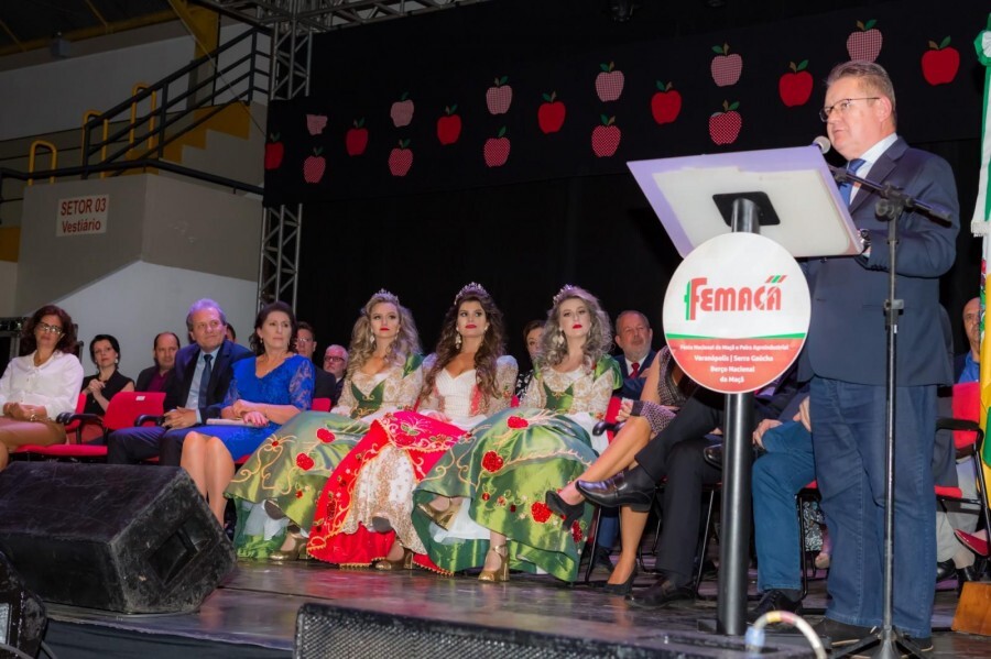 A Festa Nacional da Maçã teve sua abertura oficial naúltima sexta-feira, 12 de abril, em uma cerimônia no Ginásio Leonir Antônio Farina. Com a participação de mais de 500 convidados, a presença do vice-governador do Rio Grande do Sul, Ranolfo Vieira Júnior, deputados estaduais e federal, prefeitos, vereadores e cortes de diversos municípios da Serra gaúcha, marcaram a abertura oficial da X Femaçã. Em seu pronunciamento, o presidente da festa, Domingos Costella destacou o empenho de todos os envolvidos na realização desta edição, muitos deles voluntários, em especial a dedicação da imperatriz Fernanda Fracasso e das princesas Bruna Zanotto e Francine Bortoli na divulgação da festa. Também agradeceu o apoio das embaixatrizes e soberanas de edições anteriores da Femaçã, além de autoridades e entidades municipais, estaduais e federais, entre elas a Associação Comercial e Industrial de Veranópolis (Aciv). O presidente resgatou a história da Femaçã, que se perpetua desde 1960, quando a comunidade de Lajeadinho teve a iniciativa de realizar a 1ª Festa da Maçã. Foi no distrito onde, em 1935, o agricultor José Bin (1897-1972) plantou em sua propriedade cinco sementes de uma maçã trazida da Califórnia (Estados Unidos). Um dos pés sobreviveu e, após enxerto, produziu uma qualidade especial de maçã que não murchava e não perdia peso depois de muito tempo guardada. Bin passou a multiplicar a macieira com novos enxertos e distribuir as mudas para os vizinhos, disseminando, assim, a variedade que mais tarde viria a ser denominada José Bin. Desta forma, Veranópolis recebeu o título de Berço Nacional da Maçã, por registrar em sua história o primeiro cultivo de macieira no Brasil. "José Bin é responsável por todo o desenvolvimento da maçã no município e no Estado. Essa ousadia propiciou novas modalidades agrícolas. Foi através desse exemplo que evoluímos também na indústria", acrescentou o prefeito de Veranópolis, Waldemar De Carli. Em 1971, a Femaçã ganhou âmbito municipal com a 1ª Festa Municipal da Maçã. A celebração se tornou estadual em 1973 e, em 1976, foi alçada a Festa Nacional da Maçã, com a presença do então presidente da República Ernesto Geisel. "Começou pequena e hoje atinge patamares nacionais graças aos cidadãos veranenses, de nascimento ou de coração que, voluntariamente, num trabalho de equipe, planejam, organizam e apresentam à comunidade uma festa com inúmeras atrações", complementou Costella. Em seus discursos de boas-vindas, Fernanda, Bruna e Francine compartilharam a emoção que viveram desde a coroação. Durante o período, o trio esteve em mais de 30 municípios da Serra e em Porto Alegre, onde concederam entrevistas e visitaram as prefeituras convidando as autoridades para prestigiarem a Femaçã. "Nessa trajetória, as pessoas nos perguntavam como não cansávamos. Se pudéssemos, trabalharíamos 24 horas por dia para a Femaçã, porque tudo que vivemos se resume em uma palavra: gratidão. Gratidão por representar o município que amamos e ter o privilégio de conhecer muitas pessoas", resumiu Fernanda. O trio vestia o novo traje oficial, confeccionado por Anita e Letíca Cenci. Representando o governador gaúcho, Eduardo Leite, o vice-governador, Ranolfo Vieira Júnior, encerrou a cerimônia elogiando o evento: "Que venham novas façanhas, viva a Femaçã!", finalizou Vieria Júnior, antes de percorrer os estandes dos cerca de 100 expositores. A programação completa pode ser conferida no site do evento, em a href="http://www.femaca.com.br/programacao" www.femaca.com.br/programacao/a . SERVIÇO O que: X Femaçã – Festa Nacional da Maçã e Feira Agroindustrial Quando: de 12 a 14 e de 18 a 21 de abril de 2019. Horários de visitação à feira (expositores): dias 18, 19 e 20, das 10h às 22h. Dia 21, das 10h às 18h. Onde: Parque de Exposições José Bin, Pavilhões da Femaçã - Alameda Santos Dumont, bairro Femaçã, Veranópolis (RS). Os shows nacionais (Roupa Nova e Fernando & Sorocaba) ocorrem no Ginásio Leonir Antonio Farina Quanto: R$ 10 (entrada geral no parque). Shows nacionais terão valor diferenciado, conforme o setor e o lote. Os preços podem ser conferidos no site www.femaca.com.br. em Fotos: Ivane Costella Bissani/em