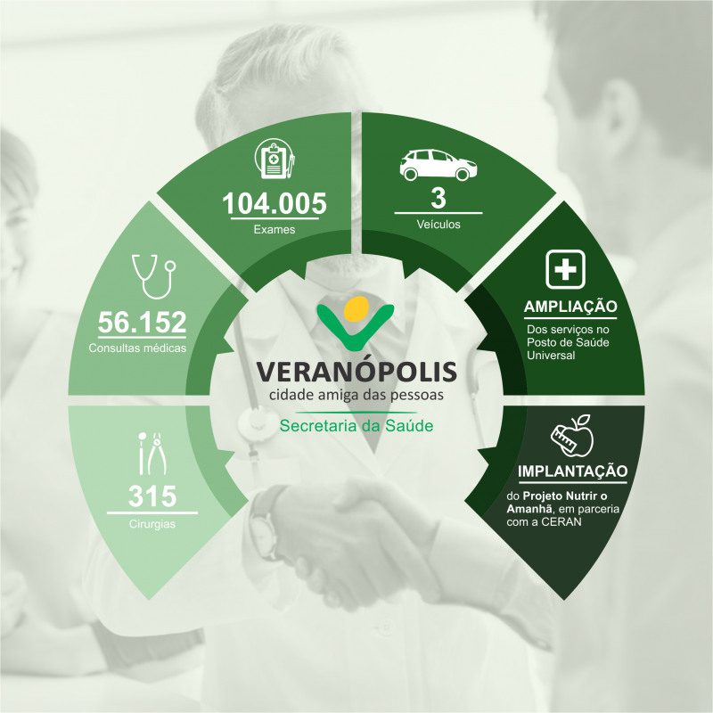 A Prefeitura Municipal de Veranópolis apresenta as ações desenvolvidas ao longo de 2018, pela Secretaria da Saúde. Exames ✓ Oferta de 3.698 exames de imagem. ✓ Oferta de 100.000 exames de laboratório. ✓ Encaminhamento de 57 exames para Caxias do Sul. ✓ Mutirão de 80 exames de Colonoscopia e 170 exames de Endoscopia. Cirurgias ✓ Oferta de 187 cirurgias eletivas no município. ✓ Oferta de 128 cirurgias oftalmológicas de catarata. Consultas ✓ 100 consultas com especialistas em Porto Alegre. ✓ 224 consultas com especialistas em Caxias do Sul. ✓ Mutirão de atendimentos Oftalmológicos no mês de dezembro: 300 pacientes foram beneficiados. ✓ Oferta de 2.071 consultas com especialistas no município. ✓ Atendimentos clínicos na Atenção Básica: 47.464 ✓ Atendimentos odontológicos na Atenção Básica: 5.644 ✓ Oferta de 349 consultas da especialidade de oftalmologia Aquisições ✓ Aquisição de veículo DOBLÓ para Vigilância Sanitária. ✓ Aquisição de veículo VAN com 20 lugares+01 motorista. ✓ Aquisição de veículo Ambulância tipo A para suporte Básico. ✓ Aquisição de Equipamentos Odontológicos. ✓ Aquisição de materiais lúdicos e brindes para o fortalecimento do atendimento infantil, priorizando a prevenção e promoção a saúde bucal. ✓ Compra de calçados para os Agentes Comunitárias de Saúde, que faz parte da lista dos Equipamentos de Proteção Individual. ✓ Compra de Uniformes para a Equipe de Controle a Endemias e Vigilância Sanitária. Ações ✓ Implantação do Projeto de Atendimento Domiciliar ao Idoso. ✓ Pintura das salas de vacinação com personagens infantis. ✓ Implantação do Projeto Nutrir o Amanhã, em parceria com a CERAN. ✓ Implantação das Brinquedotecas: Projeto Saúde Sapeca nas Unidades de Saúde, em parceria com a CERAN. ✓ Implantação do Grupo de Pele e Feridas na Rede Primária de saúde. ✓ Capacitação dos profissionais da Rede Primária, sobre diversos temas. ✓ Reorganização dos Fluxos de atendimento Pediátrico e da Mulher. ✓ Oferta de oficinas Terapêuticas na Atenção Básica. ✓ Qualificação das equipes de saúde para o atendimento ao público. ✓ Ampliação de atendimento no Posto de Saúde Universal: Atendimento Odontológico e pequenas cirurgias.
