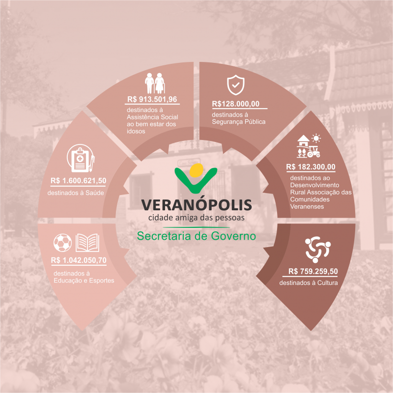 A Prefeitura Municipal de Veranópolis apresenta as ações desenvolvidas ao longo de 2018, pela Secretaria de Governo. Repasses destinados à Educação e Esportes: ✓ Academia Veranense de Assistência em Educação AVAEC - R$263.420,00 ✓ Associação Atlética Veranópolis - R$255.000,00 ✓ Associação desportiva e cultural universal - R$50.000,00 ✓ Associação dos acadêmicos e universitários de Veranópolis ACAUVE - R$337.630,70 ✓ Centro comunitário veranense de educação e assistência CECOVEA - R$60.000,00 ✓ Football club valverde recreativo e cultural - R$40.000,00 ✓ Planalto futebol clube - R$18.000,00 ✓ Esporte Clube Ipiranga - R$18.000,00 Repasses destinados à Saúde: ✓ Associação veranense de assistência em saúde AVAES - R$100.621,50 ✓ Associação veranense de assistência em saúde AVAES - R$1.500.000,00 Repasses destinados à Assistência Social: ✓ Associação das pessoas portadoras de deficiência São Camilo de Veranópolis - R$9.800,00 ✓ Associação de pais e amigos dos excepcionais de Veranópolis APAE - R$488.000,00 ✓ Associação protetora dos animais São Francisco de Assis de Veranópolis APAVE - R$87.466,00 ✓ Sociedade beneficente São Francisco - R$195.683,16 ✓ Sociedade beneficente São Francisco - R$84.552,80 ✓ Grupo de convivência da longevidade de Veranópolis - R$36.000,00 ✓ Liga feminina regional de combate ao câncer de Veranópolis, Cotiporã, Fagundes Varela e Vila Flores - R$12.000,00 Repasses destinados à Segurança Pública: ✓ Conselho comunitário pró-segurança pública de Veranópolis (consepro) - R$128.000,00 Desenvolvimento rural ✓ Associação das Comunidades Veranenses - R$80.000,00 ✓ Associação das Comunidades Veranenses - R$102.300,00 Repasses destinados à Cultura: ✓ Associação do artesão de Veranópolis ARTEVE - R$7.225,00 ✓ Associação musical de Veranópolis - R$118.534,50 ✓ CTG Rincão da Roça Reúna - R$33.500,00 ✓ Festa Nacional da Maçã e Feira Agroindustrial de Veranópolis - R$600.000,00 TOTAL R$4.665.733,66