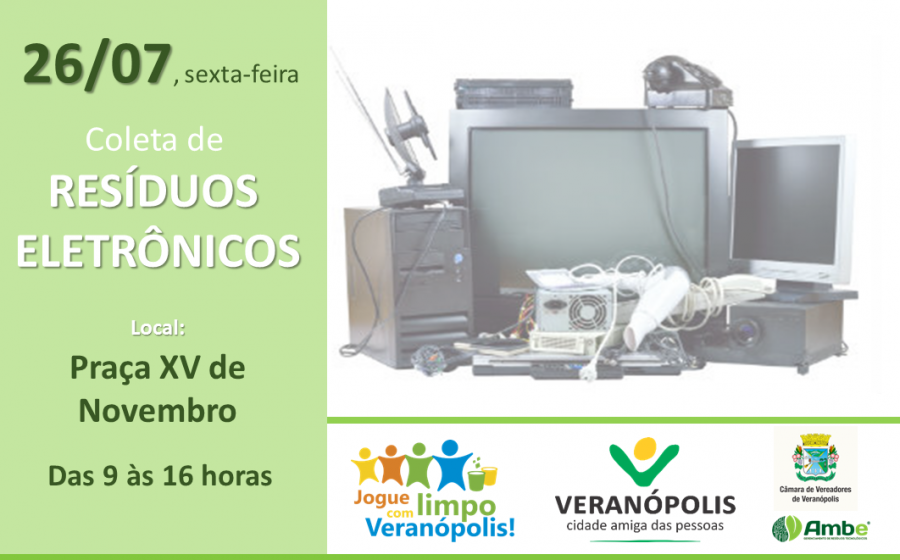 Nesta sexta-feira, 26 de julho, acontece mais uma ação de coleta de equipamentos eletrônicos em Veranópolis, na Praça XV de Novembro. Neste dia as pessoas que possuem equipamentos elétricos ou eletrônicos estragados ou obsoletos, podem realizar o descarte correto dos mesmos. Haverá um caminhão da empresa Ambe, a partir das 9h até às 16 horas. Serão recolhidos equipamentos como computadores, teclados, mouse, impressoras, notebooks, aparelhos de DVD, vídeo game, vídeo cassete, câmera fotográfica, controle remoto, televisores, telefonia em geral, geladeira, fogão, ar condicionado, micro-ondas, etc. Essa é uma atividade da Secretaria Municipal de Infraestrutura e Meio Ambiente em parceria com o CISGA e conta com o apoio da Câmara de Vereadores de Veranópolis e da empresa AMBE – Gerenciamento de Resíduos Eletrônicos, de Caxias do Sul. Jogue limpo com Veranópolis e descarte os seus resíduos de forma correta e nos locais adequados.