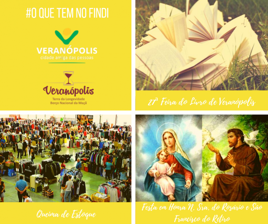 Confira a programação do final de semana em Veranópolis: Sexta 04/10 - Inauguração da Vila Fonseca, com Kako Fontanive - a partir das 20h, na Vila Fonseca - Restaurante & Centro de Eventos, Rua José do Patrocínio, 100. Informações e reservas: (54) 99634-6579 - Locomotiva Acústico - abertura do bar às 18h30min, no Zeppelin Rock Bar, Av. Pinheiro Machado, 770. Informações: (54) 99654-3460 Sábado 05/10 Campeonato Municipal de Futebol 2019 - CANCELADO Domingo 06/10 - 27ª Feira do Livro 2019 de Veranópolis 14h às 21h - Feira de livro, na Praça XV de Novembro 18h - Abertura Oficial da Feira do Livro 2019, Palco Central – Praça XV de Novembro 19h30min - Projeto "AVAECOSSISTEMA – Recicolas – Um retorno ao consumo responsável", no Palco Central. 19h30min - Coros Municipais de Veranópolis – Apresentação "No Túnel do Tempo", no Palco Central - Praça XV de Novembro. Realização: Prefeitura de Veranópolis, através Secretarias de Turismo e Cultura e de Educação, Esportes, Lazer e Juventude e Câmara de Vereados. Informações: Secretaria de Turismo e Cultura – (54) 3441-2232 / SMED - (54) 3441-7828 - 6ª Queima de Estoque da ACIV, das 10h às 18h, no Parque Municipal José Bin (Alamaeda Santos Dumont - Bairro Femaçã). Informações: ACIV (54) 3441-1099 / Secretaria de Desenvolvimento Econômico (54) 3441-1477 - Festa em Honra N. Sra. do Rosário, na Capela de N. Sra. do Rosário. Informações: Secretaria da Paróquia – (54) 3441-1604 - Festa em Honra São Francisco, na Capela São Francisco do Retiro – Linha Marquês do Herval. Informações: Secretaria da Paróquia – (54) 3441-1604 E na próxima semana: Segunda 07/10 - 27ª Feira do Livro 2019 de Veranópolis 9h às 21h - Feira de livro, na Praça XV de Novembro. 13h30min - Apresentação Projeto Mudança, no Espaço Feira - Praça XV de Novembro 15h30min - Apresentação Projeto Mudança, no Espaço Feira - Praça XV de Novembro 19h30min - Palestra com a Patronese Jane Giugno Dal Pai, no Palco Central - Praça XV de Novembro. Informações: Secretaria de Turismo e Cultura – (54) 3441-2232 / SMED - (54) 3441-7828 Terça 08/10 - 27ª Feira do Livro 2019 de Veranópolis 9h às 21h - Feira de livro, na Praça XV de Novembro. 18h - 3º Ato Literário - Biblioteca Pública Mansueto Bernardi, com a presença de Celso Ferruda, Roberto Tomasetto e Waleska Pessato Farenzena Fochesatto, no Espaço Feira - Praça XV de Novembro. 19h30min - "A Poesia que Transforma" – Palestra com Bráulio Bessa, na SOAL (vagas limitadas, mediante ingresso) Informações: Secretaria de Turismo e Cultura – (54) 3441-2232 / SMED - (54) 3441-7828 Quarta 09/10 - Doação de Sangue ao Hemocentro - durante a manhã e tarde, no pátio do Seminário, em frente a sede do Grupo de Convivência da Longevidade e da Associação São Camilo. Inscrições devem ser realizadas pessoalmente na Recepção do Posto de Saúde Central ou pelo fone 3441-1458. - 27ª Feira do Livro 2019 de Veranópolis 9h às 21h - Feira de livro, na Praça XV de Novembro. 9h às 11h - 11º Festival de Contos, Causos, Lendas e Poesias, na SOAL. 13h30 às 18h30min - 11º Festival de Contos, Causos, Lendas e Poesias, na SOAL. 18h – Palestra "Muita Medicina: como poderia ser um paradigma contra a longevidade", com Dr. Marco Bobbio, autoridade mundial e propagador da Slow Medicine, na SOAL. 19h30min - Premiação do Festival de Contos, Causos, Lendas e Poesias, na SOAL. Informações: Secretaria de Turismo e Cultura – (54) 3441-2232 / SMED - (54) 3441-7828 Quinta 10/10 - 27ª Feira do Livro 2019 de Veranópolis 9h às 21h - Feira do Livro, na Praça XV de Novembro. 18h - Clube da Leitura 2ª Edição Especial - Mediador Elcio Conte, na Biblioteca Pública Mansueto Bernardi. 19h30min - Palestra Show "O que ouvi de Raul: Considerações Filosóficas sobre um Maluco Beleza" – Giovani Matiello, no Espaço Feira – Praça XV de Novembro. Informações: Secretaria de Turismo e Cultura – (54) 3441-2232 / SMED - (54) 3441-7828 Diariamente - Casa Saretta - Centro de Atenção ao Turista BR 470, km 177, nº 2201. Informações: (54) 3441-5953 Segunda a sexta-feira das 8h30min às 17h Sábados e Domingos das 10h às 16h - Casa Saretta Artesanato BR 470, km 177, nº 2201. Informações: (54) 3441-7695 Segunda a sexta-feira das 8h30min às 11h30min e das 13h30min às 17h Sábados e Domingos das 10h às 16h De Segunda a Sexta-feira - Biblioteca Pública Mansueto Bernardi Av. Pinheiro Machado, 770 - centro (hall de entrada da SOAL). Informações: (54) 3441-7615 Segunda a sexta-feira das 8h30min às 17h Toda Quarta e Sábado - Feira Ecológica com agricultores de Veranópolis, no caramanchão ao lado do Salão N.S. de Lourdes: Quartas-feiras das 12h30min às 16 horas / Sábados das 07 às 12 horas Informações: Secretaria de Desenvolvimento Econômico: (54) 3441-1477