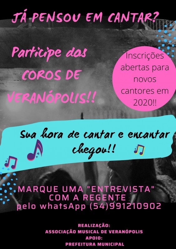 A Associação Musical de Veranópolis anuncia que estão abertas as inscrições para novas turmas nos coros infantil, juvenil e adulto. Interessados devem entrar em contato com a regente e agendar uma conversa pelo fone (54) 99121-0902. • Coro Infantil – vagas abertas para crianças de 5 a 11 anos • Coro Juvenil – vagas abertas para adolescentes e jovens de 12 a 18 anos • Coro Adulto – vagas abertas apenas para vozes masculinas a partir de 18 anos Para participar dos Coros, não existe custo nenhum, apenas o desejo por cantar. Se você tem acima de 5 anos e gosta, ou quer aprender a cantar melhor, chegou a oportunidade.