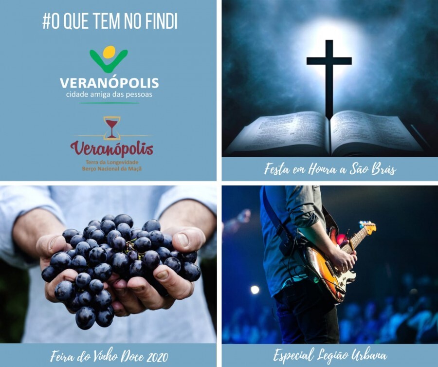 Confira a programação do final de semana em Veranópolis: Sexta 21/02 - VeraFolia Art Food Festival 2ª edição - Food Trucks, praça de alimentação e espaço kids a partir das 18h. Show com Coros na Folia às 20h, na Rua Coberta - Praça XV de Novembro. Informações: Secretaria de Turismo e Cultura (54) 3441-5953 - Crys Marques e Ferrugem - abertura do bar às 18h30min, no Zeppelin Rock Bar, Avenida Pinheiro Machado, Centro. Informações: (54) 99984-4360 o - CARNAROCK com a Banda SuperTape 90 - abertura do bar às 19h30min, no Pepper’s Pub, BR 470 (térreo do Restaurante Giratório). Informações: (54) 99114-5093 - Sexta Sertaneja com Patrick Ferreira - a partir das 23h30min, no V8 Bar, Av. Júlio de Castilhos, 84. Informações: (54) 99225-2199 ou (54) 99112-6051 - Pagode do Kinhos - às 22h, no Boteco do Bode, Av. Osvaldo Aranha, 1589. Informações: (54) 99990-7437 - Carnaval 2020 da SOAL - Show com Serpentina - a partir das 22h30min, na Sociedade Alfredochavense - SOAL (Av. Pinheiro Machado, 770 - centro). Informações e ingressos: Secretaria da SOAL - (54) 3441-1377 Sábado 22/02 - Feira agroecológica, vinho doce e agroindústrias, na Praça XV de Novembro, a partir das 8h30mnin. Informações: EMATER/ASCAR (54) 3441-1162 - VeraFolia Art Food Festival 2ª edição - Food Trucks, praça de alimentação e espaço kids a partir das 18h. Show com Samba de Moça às 20h, na Rua Coberta - Praça XV de Novembro. Informações: Secretaria de Turismo e Cultura (54) 3441-5953 Domingo 23/02 - VeraFolia Art Food Festival 2ª edição - Food Trucks, praça de alimentação e espaço kids a partir das 18h. Show com Samba de Moça às 20h, na Rua Coberta - Praça XV de Novembro. Informações: Secretaria de Turismo e Cultura (54) 3441-5953 - Festa em Honra a São Valentin, na Capela de Nossa Senhora da Glória. Informações: Secretaria da Paróquia – (54) 3441-1604 - Carnaval 2020 da SOAL - Domingo do Confete - das 16h às 20h, na Sociedade Alfredochavense - SOAL (Av. Pinheiro Machado, 770 - centro). Informações: Secretaria da SOAL - (54) 3441-1377 Segunda 24/02 - VeraFolia Art Food Festival 2ª edição - Food Trucks, praça de alimentação e espaço kids a partir das 18h. Apresentação Estúdio Life Dance às 19h30min e Show com Pagode do Dafé às 20h30min, na Rua Coberta - Praça XV de Novembro. Informações: Secretaria de Turismo e Cultura (54) 3441-5953 Terça 25/02 - VeraFolia Art Food Festival 2ª edição - Food Trucks, praça de alimentação e espaço kids a partir das 18h. Show com Ká Pra Nós às 20h, na Rua Coberta - Praça XV de Novembro. Informações: Secretaria de Turismo e Cultura (54) 3441-5953 Diariamente - Casa Saretta - Centro de Atenção ao Turista BR 470, km 177, nº 2201. Informações: (54) 3441-5953. Segunda a sexta-feira das 08h30min às 17h. Sábados e Domingos das 10h às 16h HORÁRIOS ESPECIAIS DE CARNAVAL: De 22/02 (sábado) a 24/02 (segunda) - das 10h às 16h 25/02 (terça) - fechado 26/02 (quarta) - das 13h30 às 17h - Casa Saretta - Venda de Artesanato BR 470, km 177, nº 2201. Informações: (54) 3441-7695 Segunda a sexta-feira das 08h30min às 11h30min e das 13h30min às 17h. Sábados e Domingos das 10h às 16h. HORÁRIOS ESPECIAIS DE CARNAVAL: De 22/02 (sábado) a 25/02 (terça) - das 10h às 16h 26/02 (quarta) - das 13h30 às 17h De Segunda a Sexta-feira - Biblioteca Pública Mansueto Bernardi. Informações: (54) 3441-7615 Av. Pinheiro Machado, 770 - centro (hall de entrada da SOAL). Segunda a sexta-feira das 08h às 14h HORÁRIOS ESPECIAIS DE CARNAVAL: 24/02 (segunda) e 25/02 (terça) - fechado 26/02 (quarta) - das 13h30 às 17h Toda Quarta e Sábado - Feira Ecológica com agricultores de Veranópolis, no caramanchão ao lado do Salão N.S. de Lourdes: Quartas-feiras das 12h30min às 16h / Sábados das 07h às 12h. Informações: Secretaria de Desenvolvimento Econômico: (54) 3441-1477