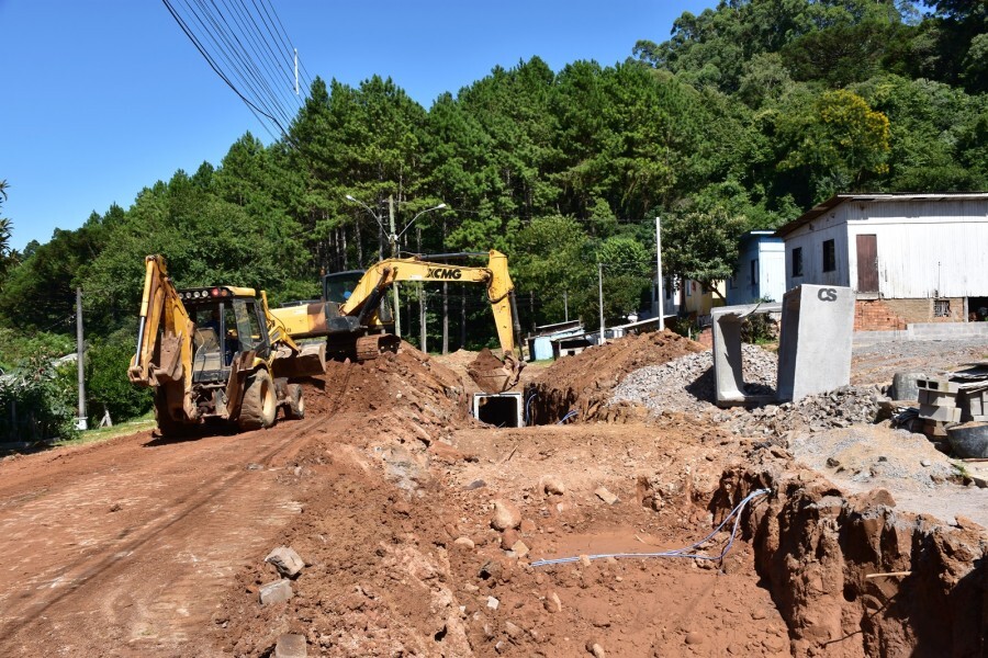 A obra da nova rede de drenagem no bairro Santo Antônio, continua em andamento, chegando na Rua Rogério Galeazzi já foram colocadas mais de 400 aduelas. Devido a algumas rochas encontradas no terreno que está sendo escavado, dificultaram um pouco o andamento dos serviços, mas essa questão já era esperada pela Secretaria Municipal de Infraestrutura e Meio Ambiente. Essa obra terá uma extensão de aproximadamente 900 metros, compreendendo a colocação de 850 aduelas, que foram adquiridas em parceria com a Corsan e a Prefeitura de Veranópolis é responsável por toda a mão de obra. Esse projeto tem previsão de conclusão em 4 meses e terá um custo total de 3 milhões de reais. A nova galeria visa garantir as condições básicas de moradia e oferecer mais qualidade de vida às pessoas de Veranópolis. Foto: Leticia Fracasso