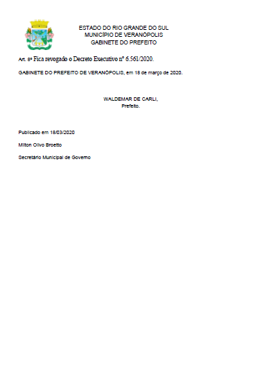 Prefeitura de Veranópolis emite Decreto Executivo Nº 6.564, de 18 de março de 2020, o qual dispõe sobre medidas temporárias de prevenção ao contágio pelo novo Coronavírus (COVID-19) no âmbito da Administração Pública Municipal. Confira no anexo.