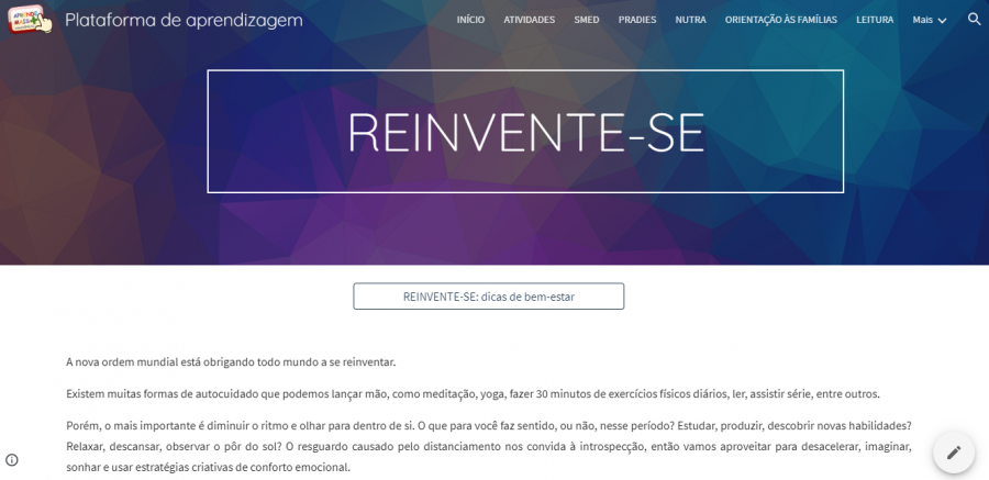 Lançado nesta semana na plataforma Aprende Mais Veranópolis, o projeto Reinvente-se: dicas de bem-estar é um espaço destinados aos pais, famílias e professores, onde serão postadas atividades de relaxamento, meditação e reflexão, por meio de dicas, vídeos e atividades. O objetivo é de contribuir com uma melhor relação pessoal, familiar e comunitária. O distanciamento social, neste período de pandemia pelo COVID-19, tem gerado diferentes reações emocionais nas crianças e adultos. Por isso, nesse momento, é muito importante que as pessoas consigam se sentir pertencentes a uma rede de afetos. O mais importante é diminuir o ritmo e olhar para dentro de si. O que para você faz sentido, ou não, nesse período? Estudar, produzir, descobrir novas habilidades? Relaxar, descansar, observar o pôr do sol? O resguardo causado pelo distanciamento convida à introspecção, então é preciso aproveitar para desacelerar, imaginar, sonhar e usar estratégias criativas de conforto emocional. Conheça o projeto:a href="%20https:/sites.google.com/view/aprendemaisveranopolis/reinvente-se" https://sites.google.com/view/aprendemaisveranopolis/reinvente-se/a