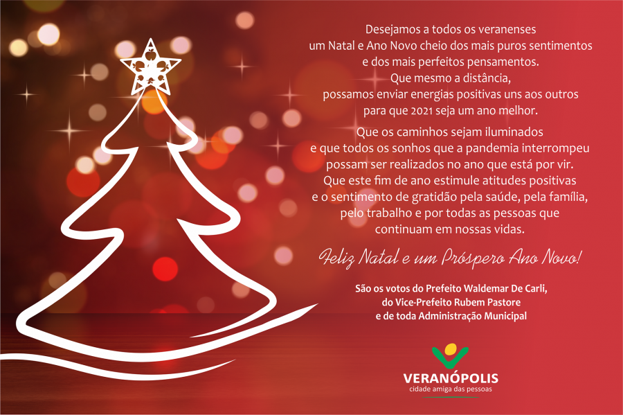 Desejamos a todos os Veranenses um Natal e Ano Novo cheio dos mais puros sentimentos e dos mais perfeitos pensamentos. Que mesmo a distância, possamos enviar energias positivas uns aos outros para que 2021 seja um ano melhor. Que os caminhos sejam iluminados e que todos os sonhos que a pandemia interrompeu possam ser realizados no ano que está por vir. Que este fim de ano estimule atitudes positivas e o sentimento de gratidão pela saúde, pela família, pelo trabalho e por todas as pessoas que continuam em nossas vidas. Feliz Natal e um próspero Ano Novo! São os votos do Prefeito Waldemar De Carli , do Vice-Prefeito Rubem Pastore e toda Administração Municipal