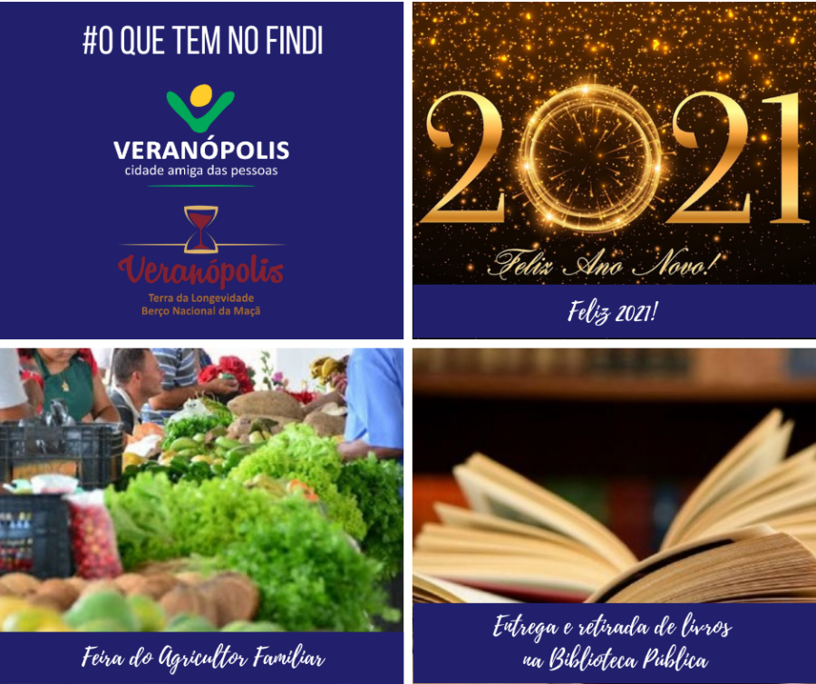 Confira a programação do final de semana em Veranópolis: Quinta 31/12 - Feira do Agricultor Familiar (direto com produtores agroecológicos e agroindustriais) - das 7h às 11h30, na Praça XV de Novembro, na Rua Coberta. Use máscara e traga sua sacola. Informações: Secretaria de Desenvolvimento Econômico: (54) 3441-1477 - Biblioteca Pública Mansueto Bernardi Av. Pinheiro Machado, 770 - centro (hall de entrada da SOAL). Das 8h30 às 17h, apenas para entrega e retirada. Não será permitida a circulação no acervo. Pesquise o acervo e renove seu empréstimo em casa através do link: pmv.phlnet.com.br. Lembrando que a Biblioteca abre nesta quarta-feira, 30, retornando na segunda, dia 4 de janeiro. Informações: Biblioteca Pública Mansueto Bernardi - (54) 3441-7615. CAMPANHAS SOCIAISProjeto Receitas com Memória - envio para E-mail: [email protected]. Informações: Secretaria de Turismo e Cultura - (54) 3441-2232 * deverá ser enviado o passo a passo, uma ou mais fotografias do processo ou da receita pronta e também deverá ser mencionada a memória resgatada com a receita reproduzida. * as receitas recebidas serão divulgadas nos meios de comunicação do município. Doação de Alimentos, Material de Higiene ou Fraldas - entrega na Secretaria de Desenvolvimento Social. Informações: Secretaria de Desenvolvimento Social - (54) 3441-7242 / (54) 3441-6419 / (54) 9 9124-8754 * as doações podem ser também em dinheiro, depositado na conta bancária da Associação Grupo Escoteiro São Luiz Gonzaga. Informações: Associação Grupo Escoteiro São Luiz Gonzaga - (54) 3441-7081