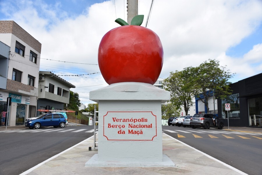 Está concluída a revitalização do monumento da maçã, localizado na entrada do município. Este importante símbolo do pioneirismo do cultivo da fruta em Veranópolis recebeu diversas melhorias, incluindo a construção de calçada, nova pintura da maçã, ampliação do local para visitação e adequações para possibilitar um acesso seguro, por meio de faixas de pedestre elevadas e de uma grade de proteção. Veranenses e turistas podem se aproximar do monumento com segurança, fazendo, assim, com que esse local volte a ser um dos principais pontos turísticos do município, resgatando e valorizando o título de Veranópolis como o Berço Nacional da Maçã. As melhorias do monumento fazem parte do Projeto de Revitalização da Avenida Júlio de Castilhos. Esse trabalho contou com a colaboração do artista plástico Alex Oliveira. em Fotos: Caroline Cesca/em
