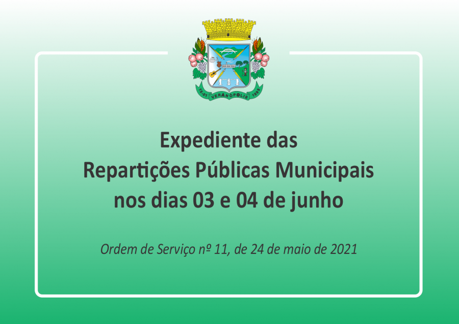 A Prefeitura de Veranópolis, por meio da Ordem de Serviço nº 11, de 24 de maio de 2021, que dispõe sobre o expediente dos órgãos públicos municipais considerando o Feriado Municipal de "Corpus Christi", no dia 03 de junho, determina que não haverá expediente nas Repartições Públicas Municipais no dia 04 de junho, sexta-feira. O disposto não se aplica ao serviço de vigilância e ao serviço na Unidade Sentinela (ESF São Francisco) que terão expediente normal. Os motoristas de ambulância ficam de sobreaviso na data referida.
