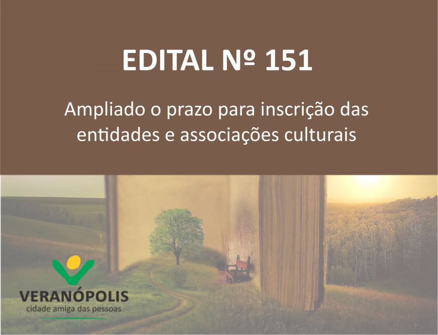 A Prefeitura de Veranópolis, por meio do Edital nº 151, de 07 de junho de 2021, ampliou o prazo para inscrição das entidades e associações culturais no novo Centro de Cultura de Veranópolis, anexo ao Seminário Seráfico São José. As inscrições previstas na cláusula quarta – das inscrições, do edital nº 132, de 21 de maio de 2021, fica ampliado para o período de 07/06/2021 a 11/06/2021, das 8h30min às 11h30min e das 13h30min às 17h, de segunda à sexta-feira, na Secretaria de Turismo e Cultura, localizada na Casa Saretta (BR 470, k177 nº 2201) mediante o preenchimento de formulários que não deverão ter rasuras e da entrega da documentação, conforme itens 3.1.1 do referido Edital. Mais informações podem ser obtidas pelos telefones 3441-5953 ou 3441-2232. em Confira o edital na íntegra abaixo./em
