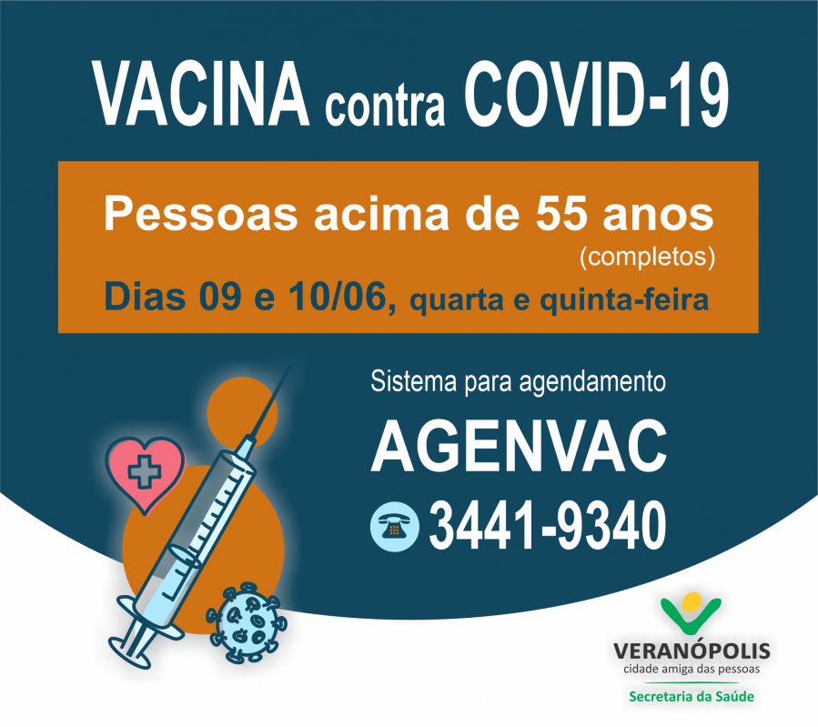 A Campanha de Vacinação contra a Covid-19 em Veranópolis, entra em uma nova fase, iniciado a imunização por faixa etária para as pessoas que têm menos de 60 anos e não possuem comorbidades. Nesta quarta e quinta-feira, dias 09 e 10 de junho, estará disponível a vacinação para pessoas com idade acima de 55 anos (completos). A vacinação para esse público será realizada em todos os Postos de Saúde do município, a partir das 8 horas da manhã, e deve ser agendada pelo AGENVAC = telefone (54) 3441-9340. No dia da vacinação é necessário apresentar documento de identificação, CPF, Cartão de Vacinação e Cartão do SUS. O AGENVAC (3441-9340) funciona 24 horas por dia, 7 dias por semana.