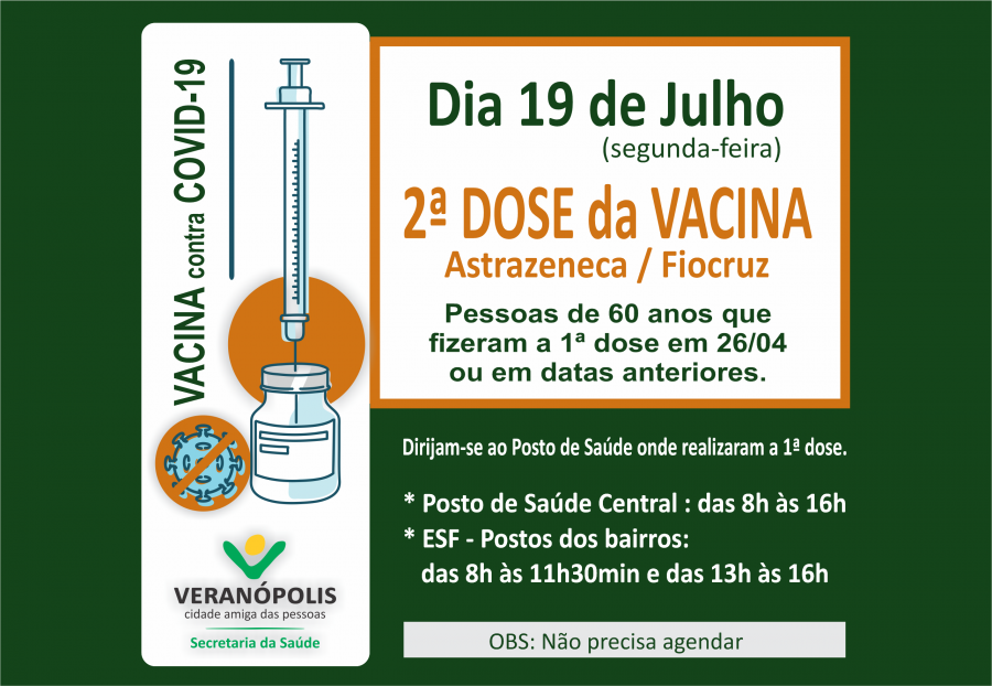 A Secretaria da Saúde de Veranópolis informa que na segunda-feira, dia 19 de julho, estará disponível em todos os postos de saúde do município, a 2ª dose do imunizante contra a Covid-19 da Astrazeneca - laboratório Fiocruz, para as pessoas de 60 anos que realizaram a 1ª dose da vacina no dia 26/04 ou em datas anteriores para os que os estão com a vacina em atraso. Não precisa realizar agendamento, as pessoas devem se dirigir ao Posto de Saúde onde receberam a 1ª dose para agora completarem seu esquema vacinal. Horário de atendimento: ▪️ Posto de Saúde Central: das 8h às 16h (sem fechar ao meio-dia) ▪️ ESF - Postos dos Bairros: das 8h às 11h30min e das 13h às 16h. Lembre-se de levar junto um documento de identificação e o cartão de vacinação. É importante reforçar que completar o esquema vacinal com as 2 doses é fundamental para garantir a proteção completa contra a Covid-19.
