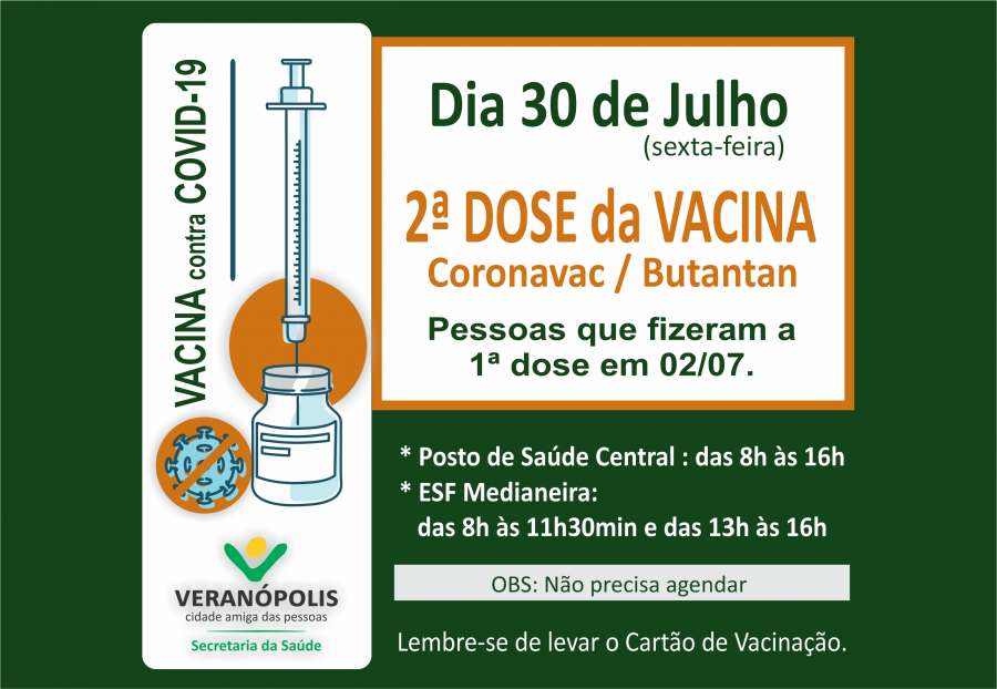 A Secretaria da Saúde de Veranópolis informa que na sexta-feira, dia 30 de julho, estará disponível a 2ª dose do imunizante contra a Covid-19 da Coronavac - laboratório Butantan, para as pessoas que realizaram a 1ª dose da vacina no dia 02/07. Não precisa realizar agendamento, as pessoas devem se dirigir ao Posto de Saúde Central e do bairro Medianeira para completarem seu esquema vacinal com a 2ª dose. Horário de atendimento: ▪️ Posto de Saúde Central: das 8h às 16h (sem fechar ao meio-dia) ▪️ ESF - Medianeira: das 8h às 11h30min e das 13h às 16h. Lembre-se de levar junto um documento de identificação e o cartão de vacinação. É importante reforçar que completar o esquema vacinal com as 2 doses é fundamental para garantir a proteção completa contra a Covid-19. Se alguma pessoa está com a 2ª dose da vacina Butantam/Coronavac em atraso, deve entrar em contato com a Secretaria da Saúde pelo fone 3441-1458, para verificar a disponibilidade de doses.