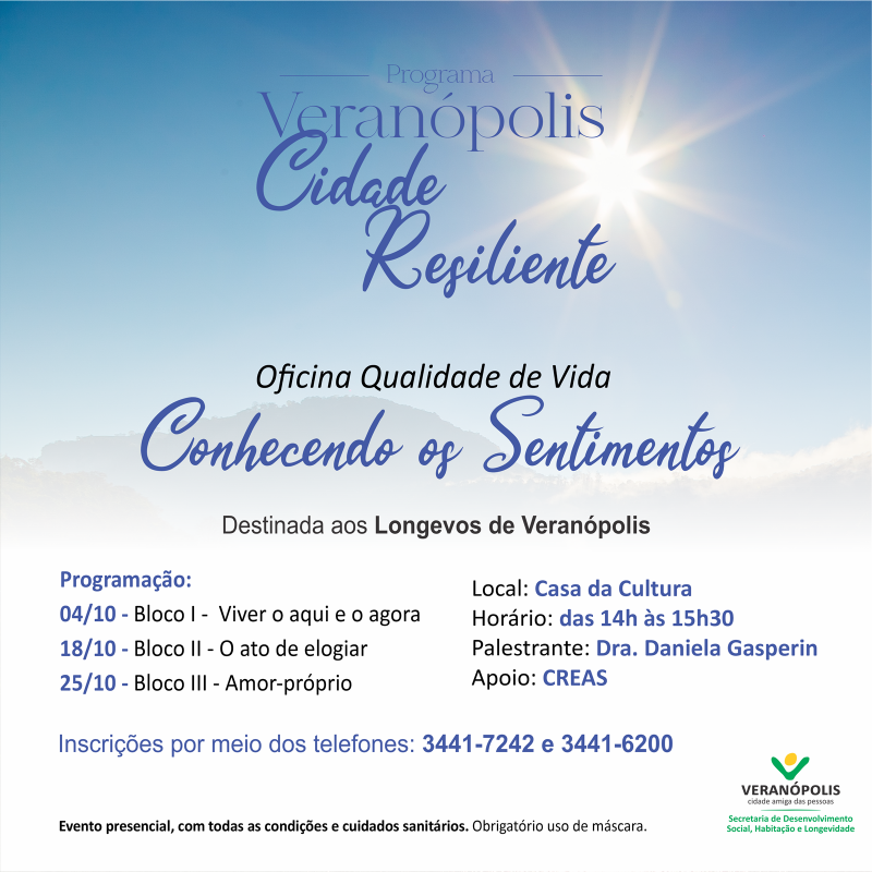 A Secretaria de Desenvolvimento Social, Habitação e Longevidade, por meio do Programa Veranópolis Cidade Resiliente, com apoio do CREAS, está promovendo a "Oficina Qualidade de Vida: Conhecendo os Sentimentos". A ação é destinada aos longevos de Veranópolis e será realizada em três blocos, sendo: Dia 04 de outubro, bloco I - Viver o aqui e o agora; Dia 18 de outubro, bloco II - O ato de elogiar Dia 25 de outubro, bloco III - Amor-próprio. A oficina será realizada na Casa da Cultura Frei Rovílio Costa, das 14h às 15h30, com a palestrante Dra. Daniela Gasperin. As inscrições podem ser feitas pelos telefones: 3441-7242 e 3441-6200.