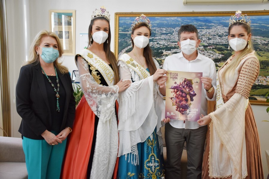 Na manhã desta segunda-feira, dia 29 de novembro, o Prefeito de Veranópolis, Waldemar De Carli, recebeu em seu gabinete a corte da Festa da Uva 2022. A Rainha, Pricila Zanol e as princesas Bianca Fabro Ott e Bruna Mallmann, acompanhadas da Vice-prefeita de Caxias do Sul, Paula Ioris, realizaram o convite ao Prefeito e a toda a comunidade de Veranópolis para participarem da 33ª edição da Festa da Uva que acontece no período de 18 de fevereiro a 06 de março de 2022. Evento que tem como tema: "Juntos outra vez!". Desfile cênico musical, compras, gastronomia, shows, degustação de uvas e feira multissetorial são as principais atrações deste evento que é uma das maiores festas da Serra Gaúcha. Foto: Leticia Fracasso