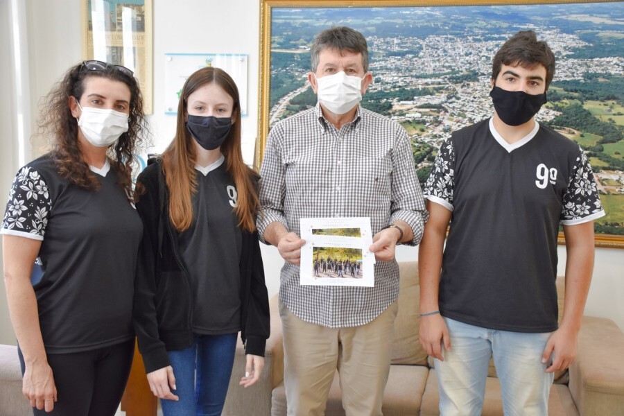 Na sexta-feira, dia 10 de dezembro, o Prefeito Waldemar De Carli recebeu em seu Gabinete representantes da turma do 9º ano da Escola Municipal de Ensino Fundamental Irmão Jerônimo, para convida-lo para a formatura da turma que acontece no dia 22 de dezembro de 2021, na Casa da Cultura Frei Rovílio Costa. Foto: Leticia Fracasso