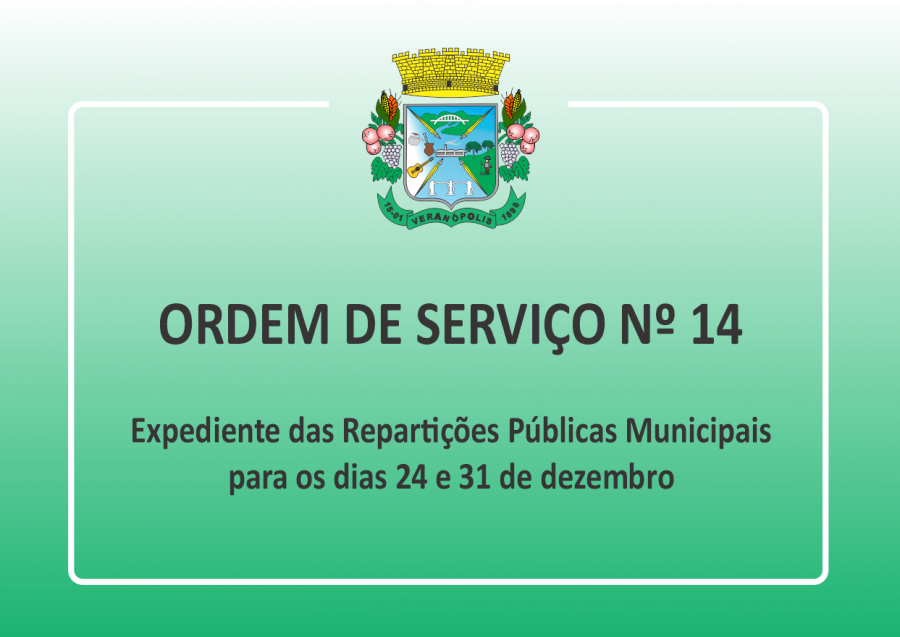 A Prefeitura Municipal de Veranópolis, por meio da Ordem de Serviço nº 14, de 08 de dezembro de 2021, dispõe sobre o expediente dos Órgãos Públicos Municipais para este final de ano. Considerando que no dia 24 e 31 de dezembro, na parte da tarde, já está determinado pela Lei Municipal nº 3.741 que não há expediente nos órgãos Municipais, a ordem de serviço determina que no dia 24 de dezembro de 2021, o expediente será somente até às 11h30min. Já no dia 31 de dezembro, não haverá expediente nas Repartições Públicas Municipais. A Secretaria Municipal da Saúde informa que não haverá expediente em todas as Unidades de Saúde, incluindo os setores administrativos, no dia 24 de dezembro de 2021, pela parte da manhã. O serviço de vigilância terá expediente normal. Os motoristas de ambulância ficam de sobreaviso nas datas referidas acima.