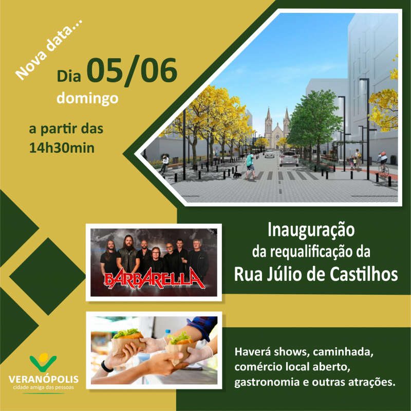 Devido a previsão do tempo indicar chuva para este final de semana, o evento de inauguração da requalificação da Rua Júlio de Castilhos, que estava programado para o domingo foi transferido para o dia 05 de junho. Neste dia as ruas centrais da cidade serão trancadas e a partir das 14h30min, haverá shows, caminhada, gastronomia, além de atrações diversas e o comércio local estará aberto. Todos estão convidados para participarem desse momento festivo, num espaço que foi projetado e realizado para que as pessoas de todas as idades aproveitem e façam uso. Vem pra a Júlio de Castilhos no outro domingo, dia 05 de junho, a tarde para aproveitar o show da banda Barbarella, artistas locais, as lojas abertas e muita gastronomia boa. Mais uma importante obra que a Administração Municipal entregará para a comunidade veranense.