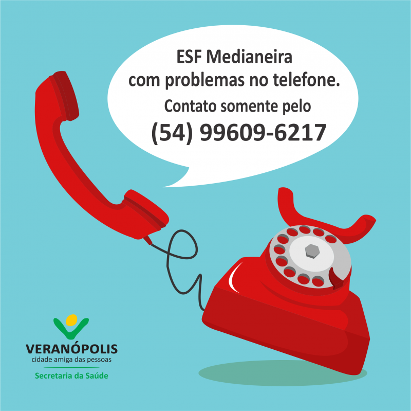 A Secretaria da Saúde de Veranópolis comunica que não está funcionando o telefone do ESF Medianeira. Para contato, usar (54) 99609-6217 - Celular da Unidade.