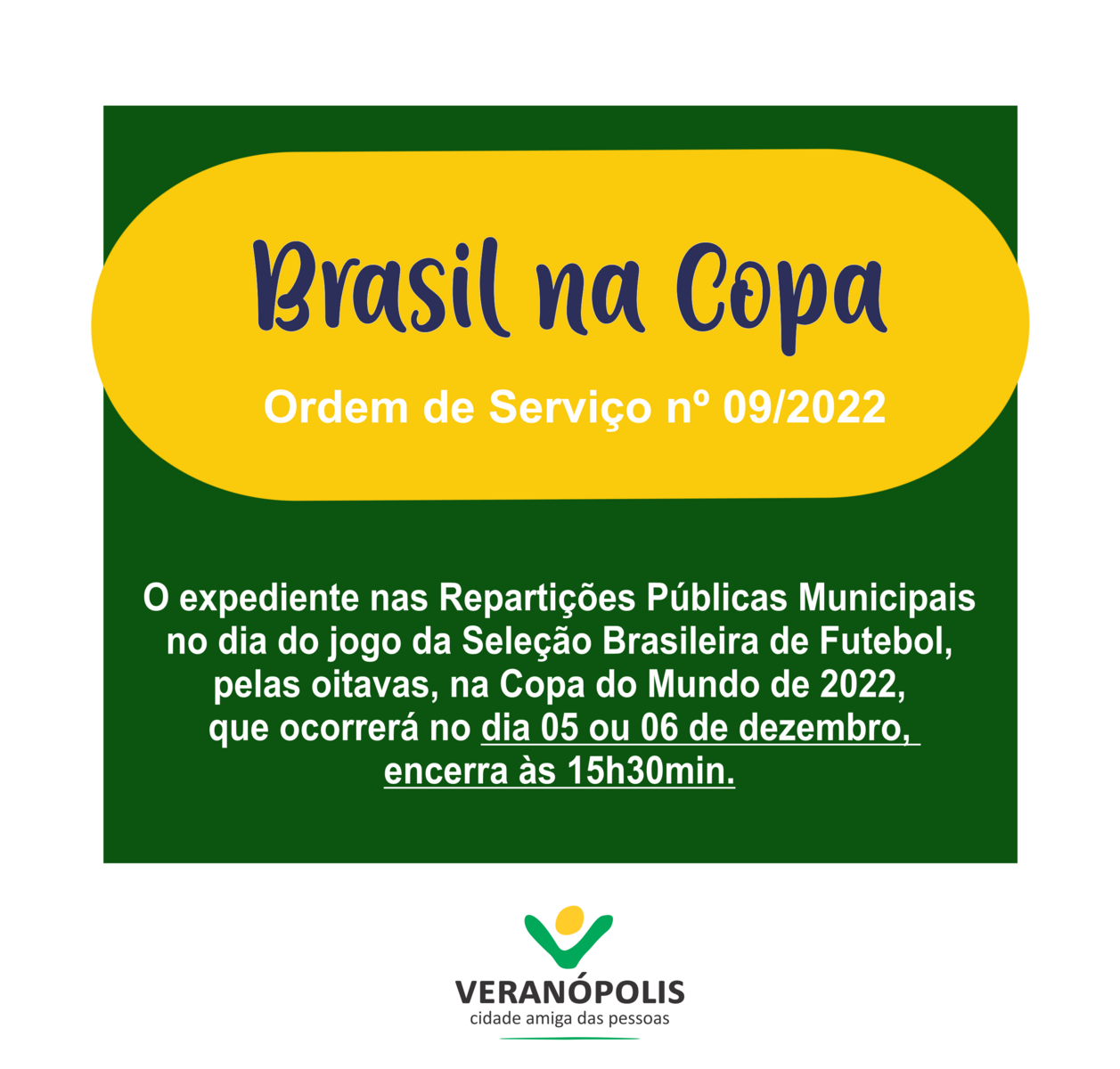 A Prefeitura de Veranópolis, informa que conforme a Ordem de serviço nº 09/2022, o expediente nas Repartições Públicas Municipais no dia do jogo da Seleção Brasileira de Futebol, pelas oitavas, na Copa do Mundo de 2022, que ocorrerá no dia 05 ou 06 de dezembro, às 16 horas, encerra às 15h30min.
