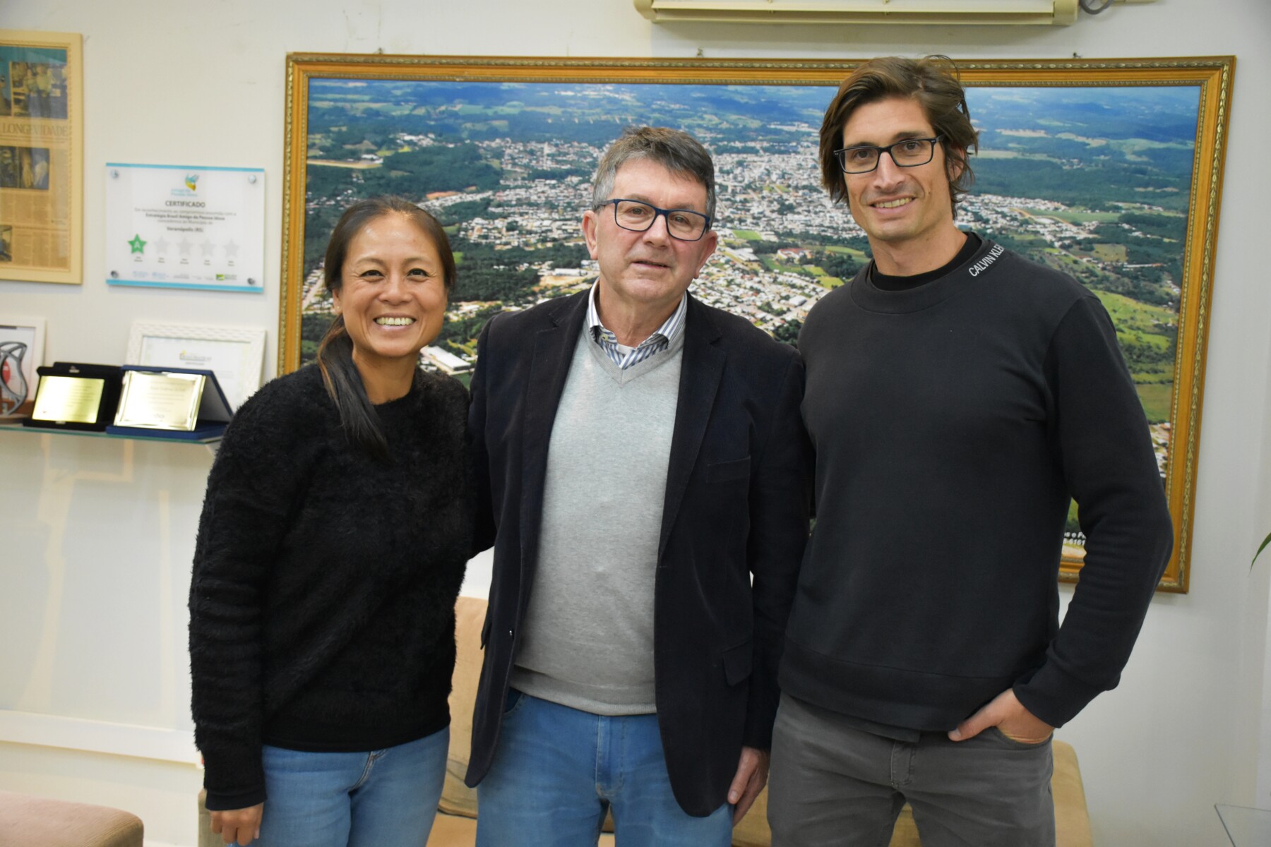Na semana que passou o Prefeito de Veranópolis, Waldemar De Carli, recebeu em seu gabinete a jornalista e especialista em gerontologia, Lilian Liang, e o cineasta e documentarista, Gabriel Martinez, profissionais que estão realizando a Expedição Longevidade.