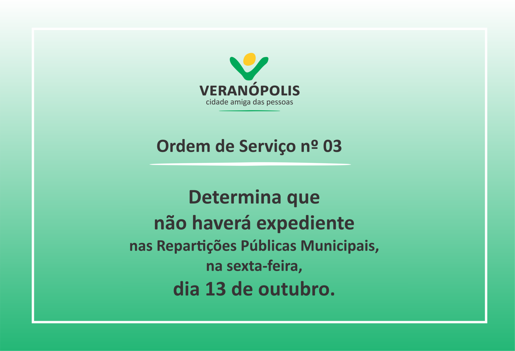 A Prefeitura de Veranópolis, divulga a Ordem de Serviço nº 3, de 03 de outubro de 2023, a qual dispõe sobre o expediente dos órgãos Públicos Municipais e determina que devido ao Feriado de “Nossa Senhora Aparecida”, na quinta-feira, dia 12 de outubro, não haverá expediente nas Repartições Públicas Municipais, no dia 13 de outubro de 2023, sexta-feira.