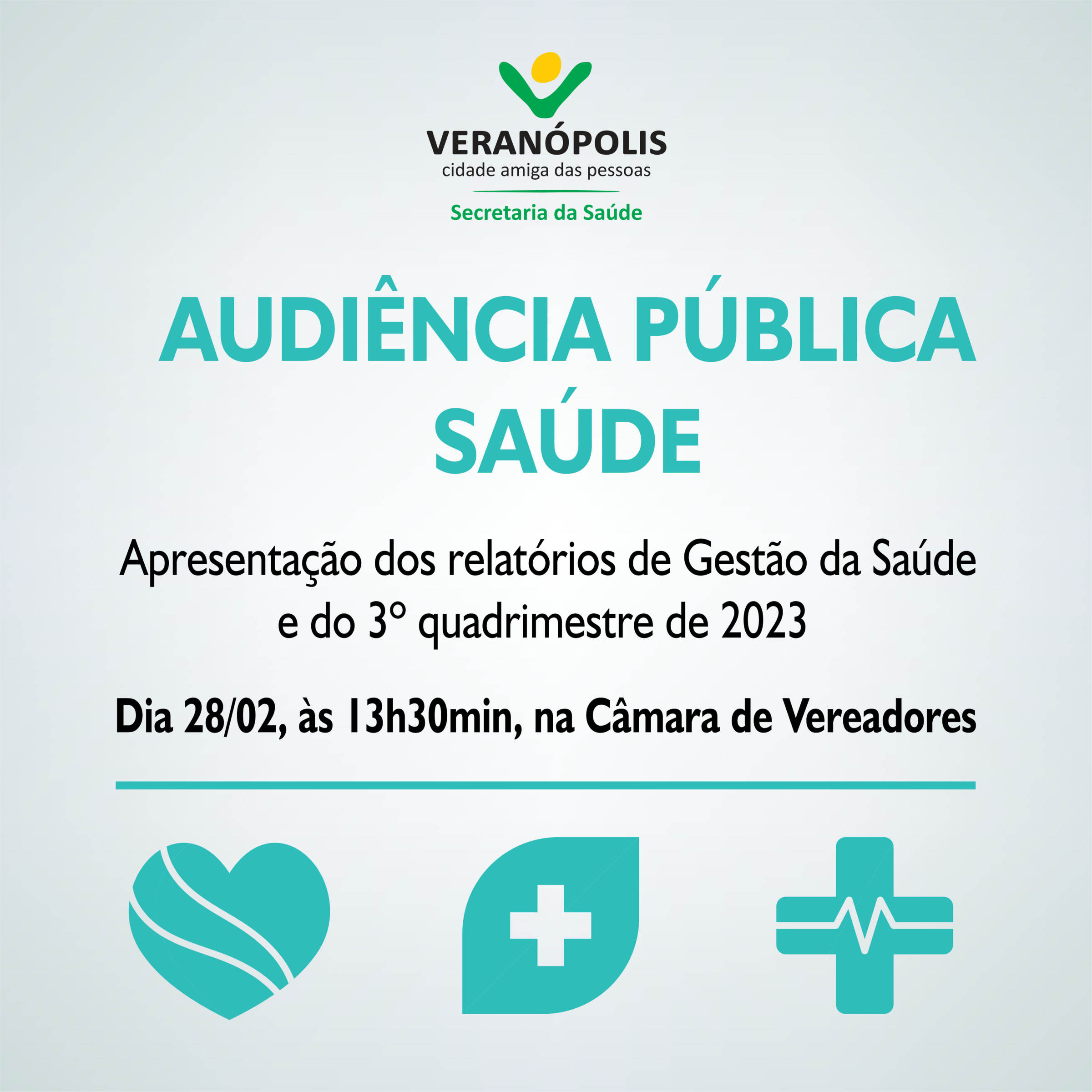 A Secretaria da Saúde de Veranópolis divulga a realização de Audiência Pública para apresentação de relatórios de gestão do terceiro quadrimestre de 2023, que se ocorrerá no dia 28 de fevereiro de 2024, quarta-feira, às 13h30min, na câmara de Vereadores do município.