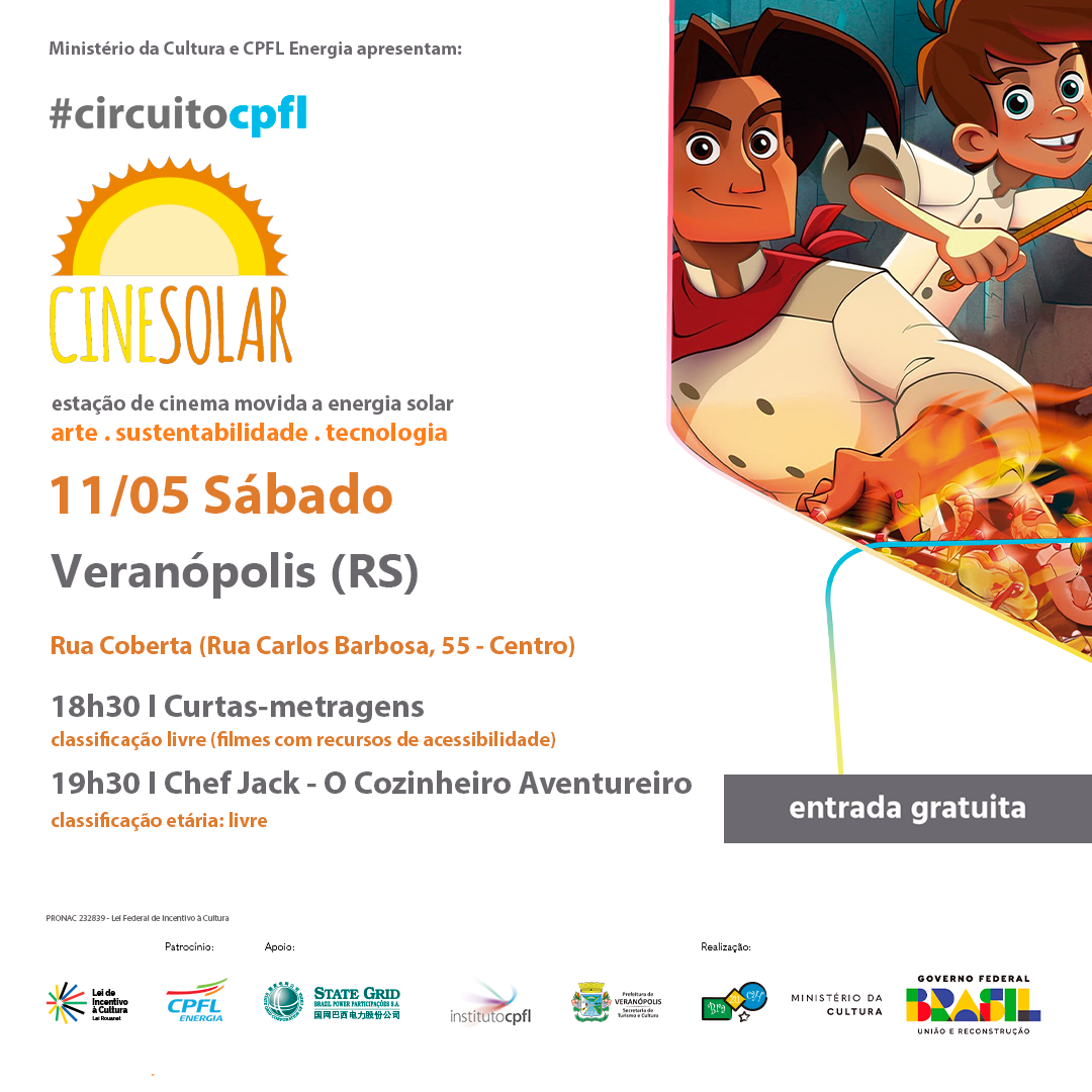 A 8ª edição do CineSolar é viabilizada pela Lei Federal de Incentivo à Cultura, com patrocínio do Grupo CPFL Energia, que tem a State Grid como acionista majoritária, apoio do Instituto CPFL e da Prefeitura de Veranópolis, por meio da Secretaria Municipal de Turismo e Cultura, e é realizada pela Brazucah Produções, Ministério da Cultura e Governo Federal.