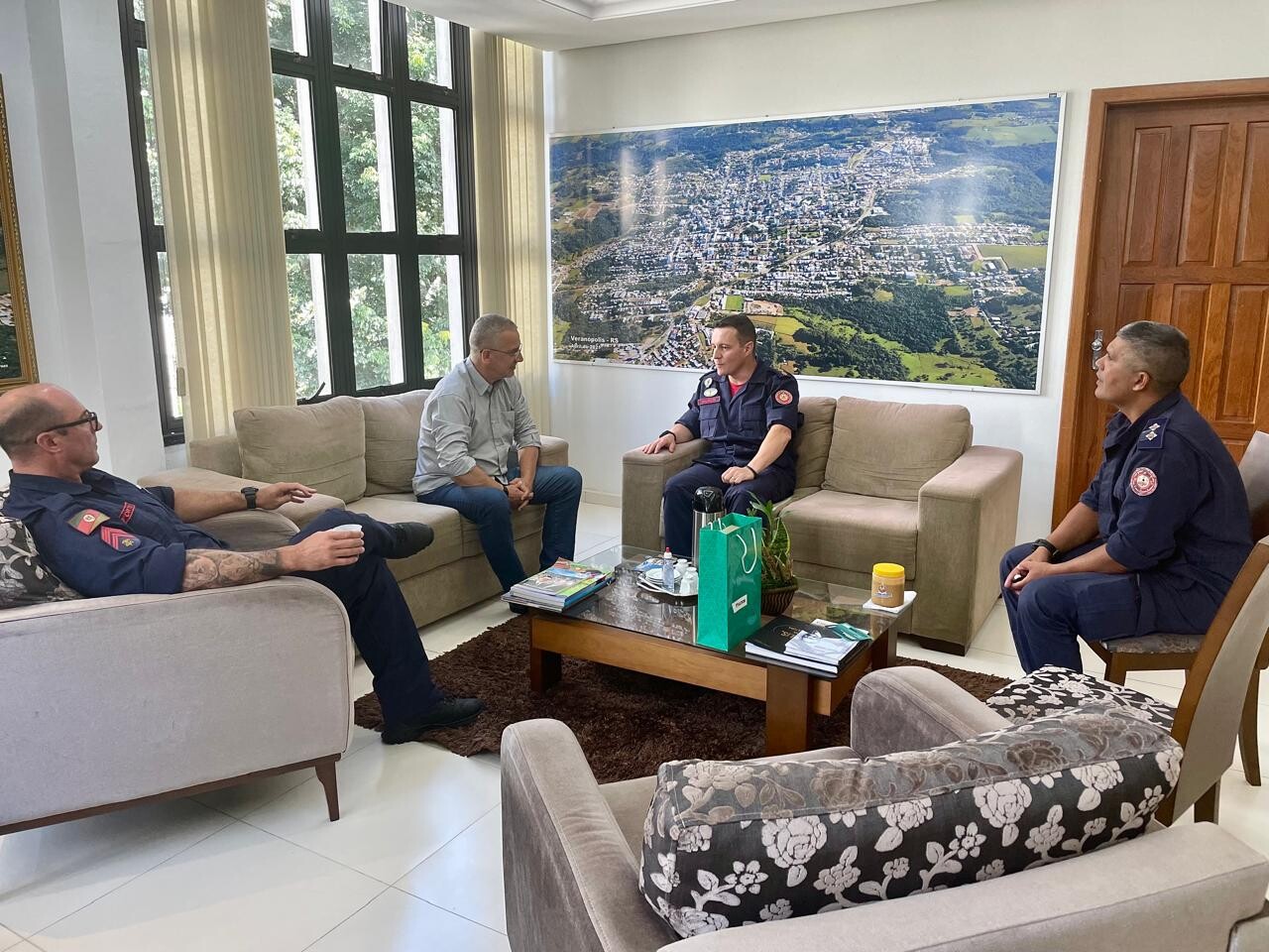Na última quarta-feira, dia 15, o prefeito de Veranópolis, Cristiano Valduga Dal Pai, recebeu o Coronel Maurício Ferro Corrêa, Comandante do 2º Comando Regional de Bombeiros Militares, com sede em Caxias do Sul, para uma conversa sobre o desempenho do 4º Pelotão do Corpo de Bombeiros Militar, que tem sua base em Veranópolis. Também participaram do encontro o Comandante local, César Forte, e o Tenente Flávio.