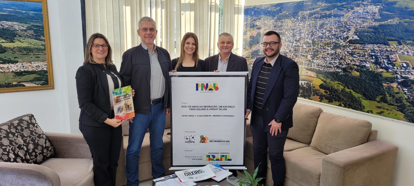 Na última semana, o prefeito de Veranópolis, Cristiano Valduga Dal Pai, acompanhado da diretora de Cultura, Diana Alessio, juntamente com o prefeito de Cotiporã, José Carlos Breda, e do vice-prefeito, Dener Zanella receberam a visita de Carla Todeschini Sasso, representante do projeto “Nos 150 Anos da Imigração, um Esforço para Salvar a Língua Talian”.
