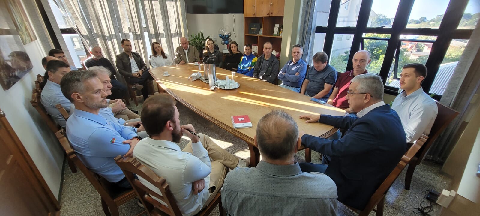 Durante a reunião, o prefeito Cristiano Valduga Dal Pai, acompanhado pelos secretários João Augusto Fracasso (Desenvolvimento Econômico) e Cesar Salvetti (Finanças), apresentou as primeiras ações da nova gestão, os projetos em fase de estudo e fez projeções para os próximos anos — abordando, inclusive, os possíveis impactos da Reforma Tributária nos municípios.