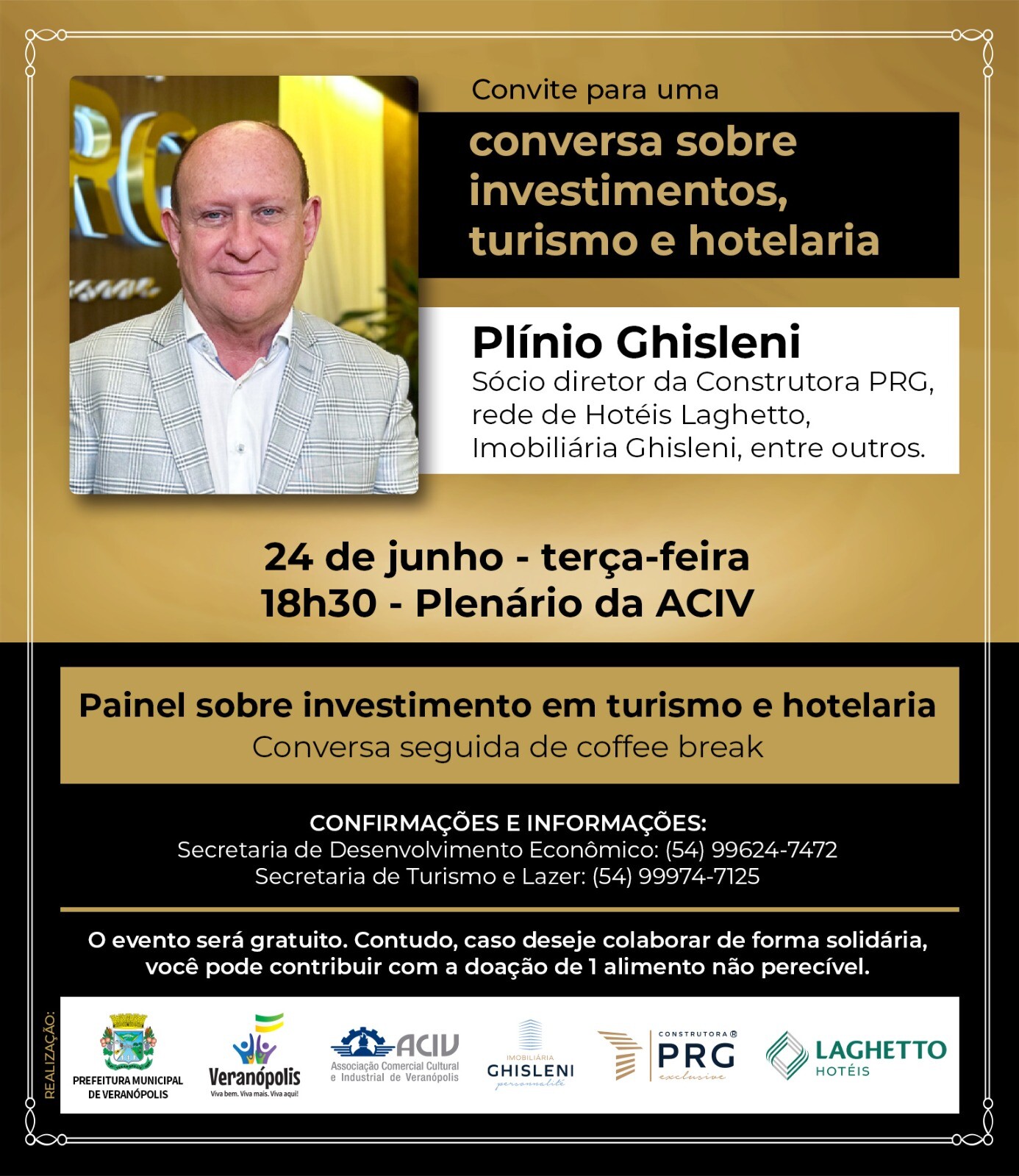 As Secretarias Municipais de Desenvolvimento Econômico e de Turismo e Lazer de Veranópolis promovem, no dia 24 de junho, terça-feira, às 18h30min, no plenário da ACIV, o Painel sobre Investimentos, Turismo e Hotelaria, com a presença de Plínio Ghisleni, sócio-diretor da Construtora PRG, da rede de Hotéis Laghetto, da Imobiliária Ghisleni, entre outros empreendimentos de destaque.