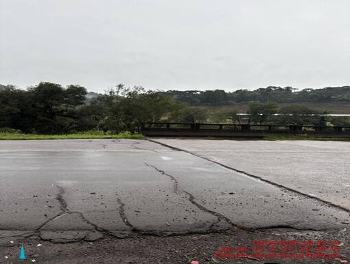 - Ponte em Santa Bárbara: Agravamento do degrau de 7cm entre a ponte e o asfalto; foram identificadas rachaduras, mas a estrutura não apresenta risco imediato.