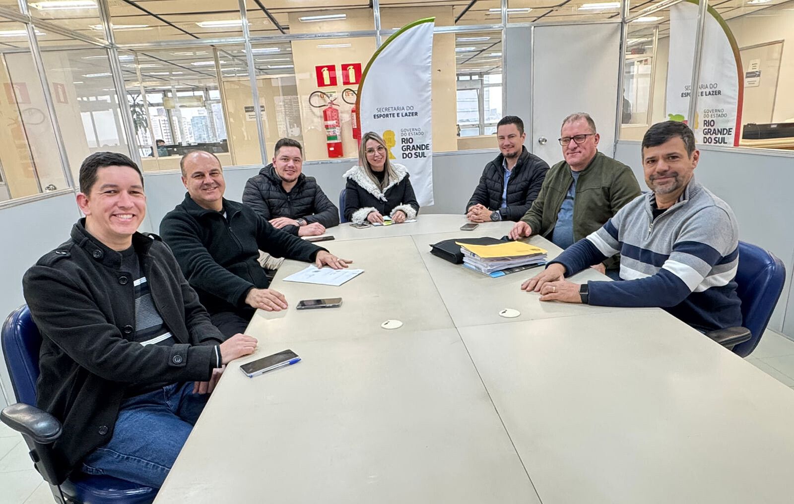 Participaram da reunião: o Prefeito em Exercício Rodrigo Costa, o vereador Pastor Elias Dornelles, o Secretário Parlamentar Moisés Pértile, Roseli Albuquerque (Diretora Administrativa da Secretaria de Esportes do Rio Grande do Sul), Charles Barragan (Diretor Geral Adjunto), Darlan Marini (Assessor Técnico) e Marcelo Arruda (ex-Presidente da Famurs).