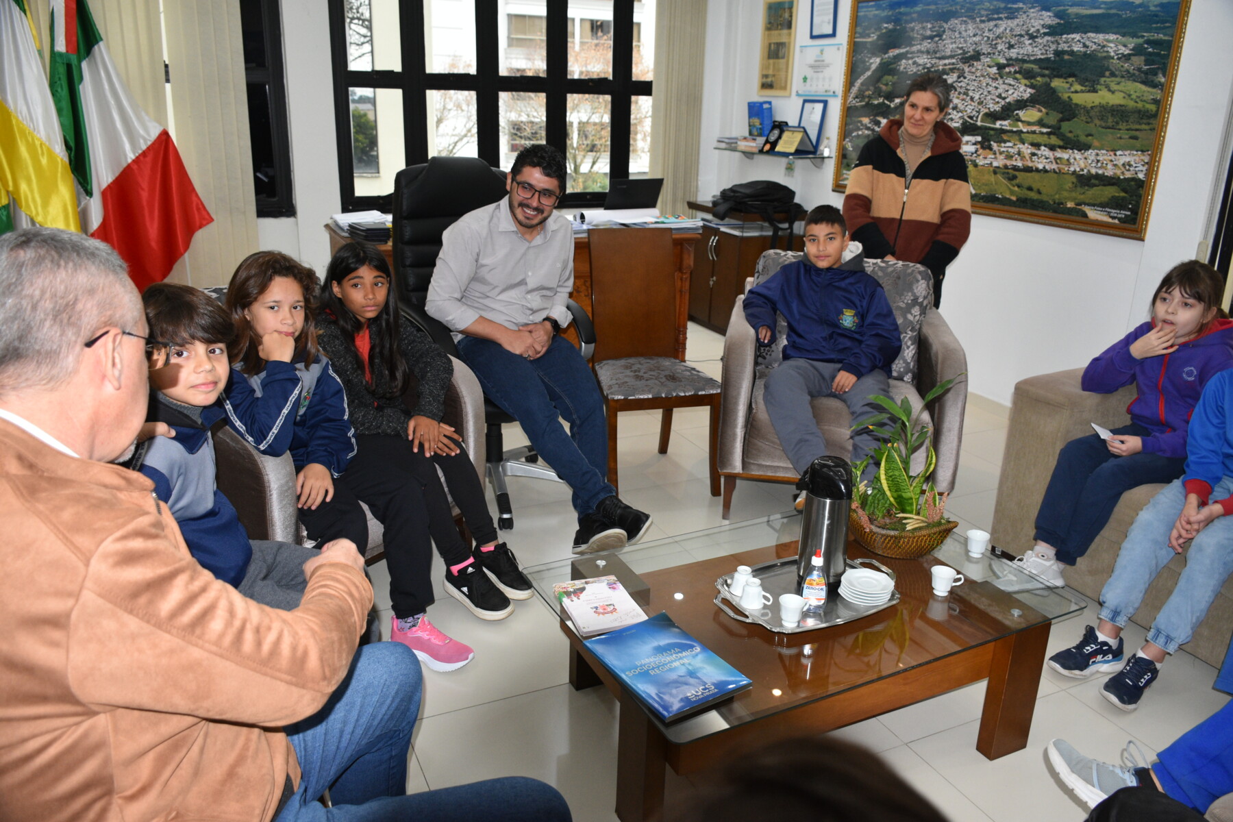 Na visita mais recente, estiveram presentes as turmas de quinto ano da Escola Municipal Adriano Farina, acompanhadas de seus professores. Durante a conversa, os alunos solicitaram melhorias na rede elétrica da escola e a instalação de laboratórios de ciências e informática.