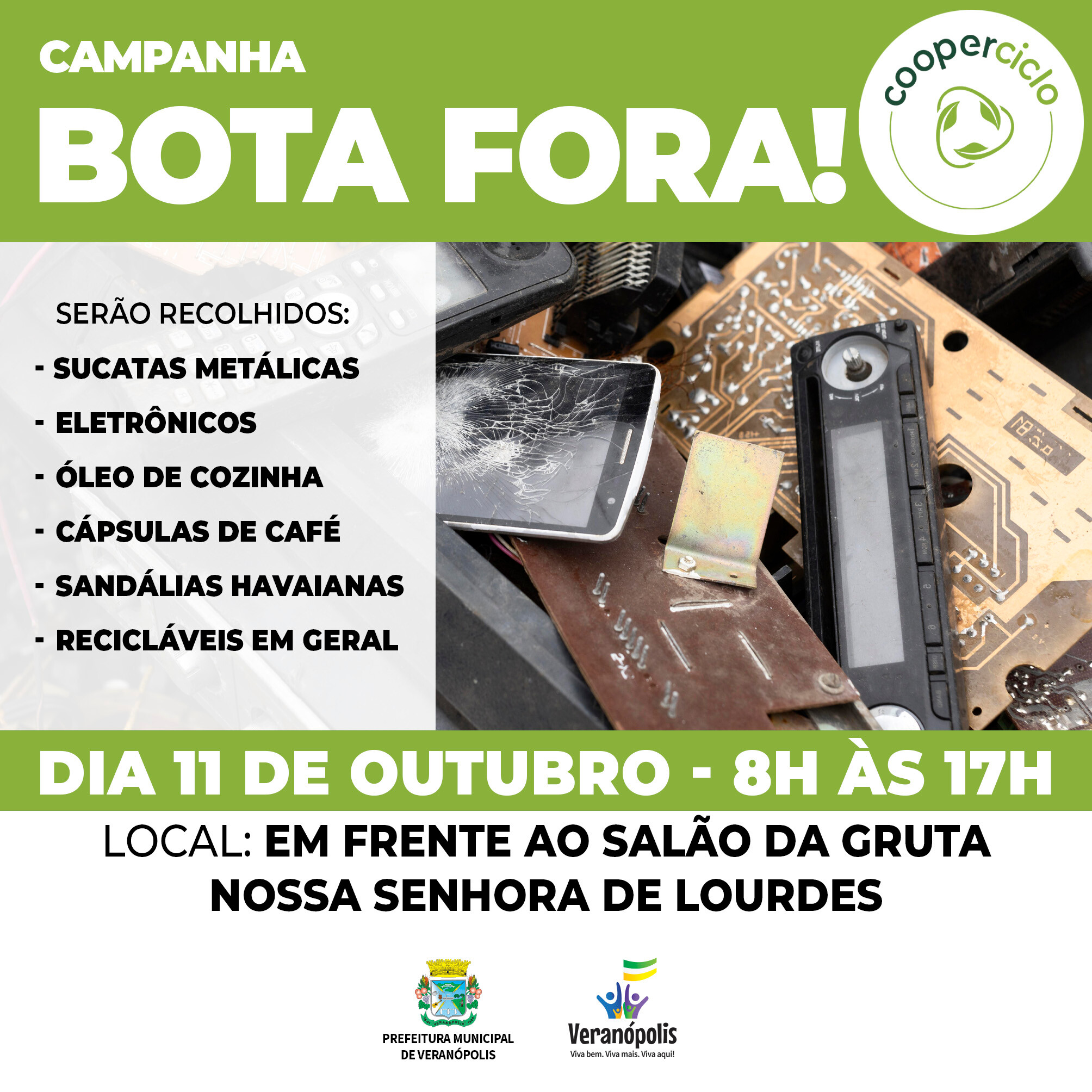 Acontece no dia 11 de outubro (sábado) mais uma edição da Campanha Bota Fora, promovida pela Prefeitura de Veranópolis, em parceria com a Cooperativa Cooperciclo. A ação tem como objetivo incentivar o descarte correto de materiais recicláveis, contribuindo para a preservação ambiental e a limpeza das comunidades atendidas.