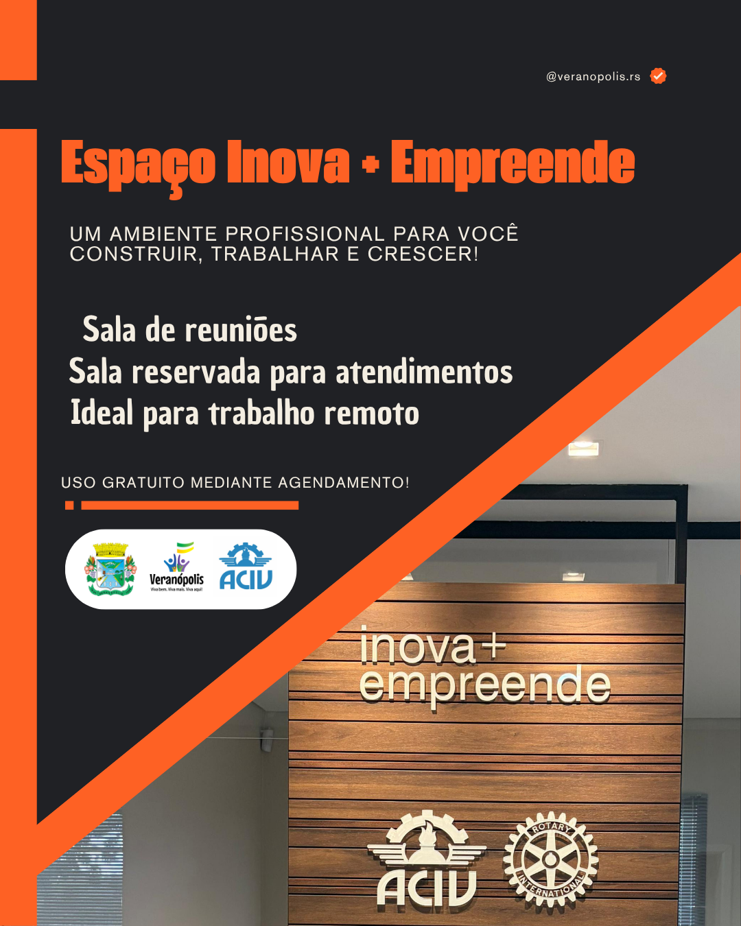 A Associação Comercial e Industrial de Veranópolis (ACIV), em parceria com o Rotary Club de Veranópolis, o Sicredi Serrana e o Município de Veranópolis, disponibiliza à comunidade empreendedora o Espaço Inova+ Empreende, um ambiente estruturado para trabalho e desenvolvimento de atividades profissionais.