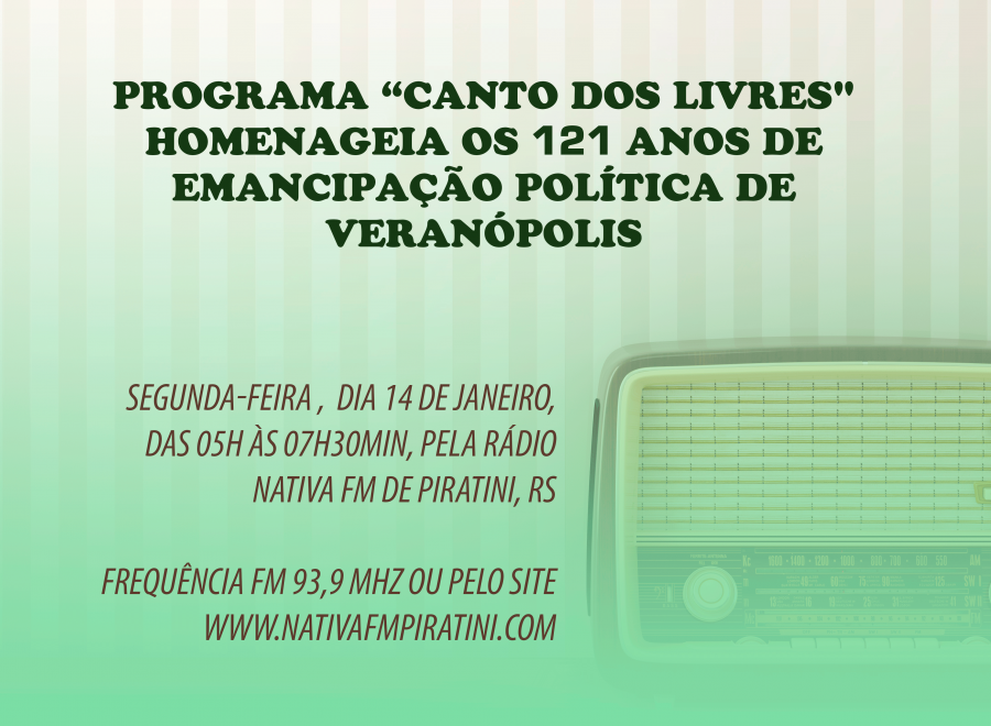 O programa radiofônico "CANTO DOS LIVRES", produzido pela Rádio Nativa FM de Piratini, Rio Grande do Sul, homenageará os 121 anos de Emancipação Política de Veranópolis no dia 14 de janeiro. A rádio abrange 21 municípios da região sul do Rio Grande do Sul, incluídas cidades como Pelotas e Bagé, contando com mais de 500.000 ouvintes. O programa é veiculado de segunda-feira à sexta-feira, das 05h às 07h30min, pela frequência FM 93,9 MHZ, e pode ser sintonizado pelo site www.nativafmpiratini.com