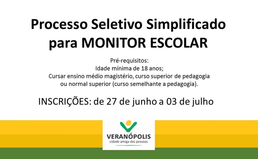 O Município de Veranópolis torna público que, conforme Edital nº 102, de 24 de junho de 2019, durante o período de 27 de junho a 03 de julho de 2019, estão abertas as inscrições para o processo seletivo simplificado, visando selecionar profissional para contrato temporário na função de monitor escolar, 30 horas semanais Os pré-requisitos são: - Idade mínima de 18 anos; - Cursar ensino médio magistério, curso superior de pedagogia ou normal superior (curso semelhante a pedagogia). Maiores informações pelo fone 54 3441 1477 – ramal 2057, e-mail [email protected], ou no Centro Administrativo Saul Irineu Farina. Confira o edital na íntegra: a href="../portal-da-transparencia/6/processos-seletivos/83/processos-seletivos-2019/arquivo/2019" http://www.veranopolis.rs.gov.br/portal-da-transparencia/6/processos-seletivos/83/processos-seletivos-2019/arquivo/2019/a