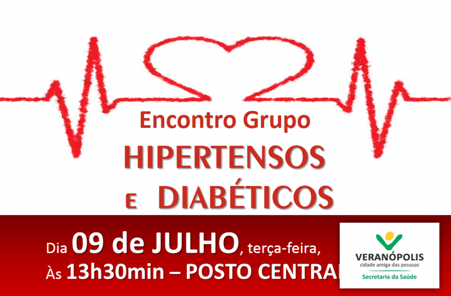 A Secretaria Municipal da Saúde informa que na próxima terça-feira, 09 de julho, acontece mais um encontro do Grupo de Hipertensos e Diabéticos do Posto de Saúde Central. Será na sala de reuniões da Secretaria de Saúde, às 13h30min.