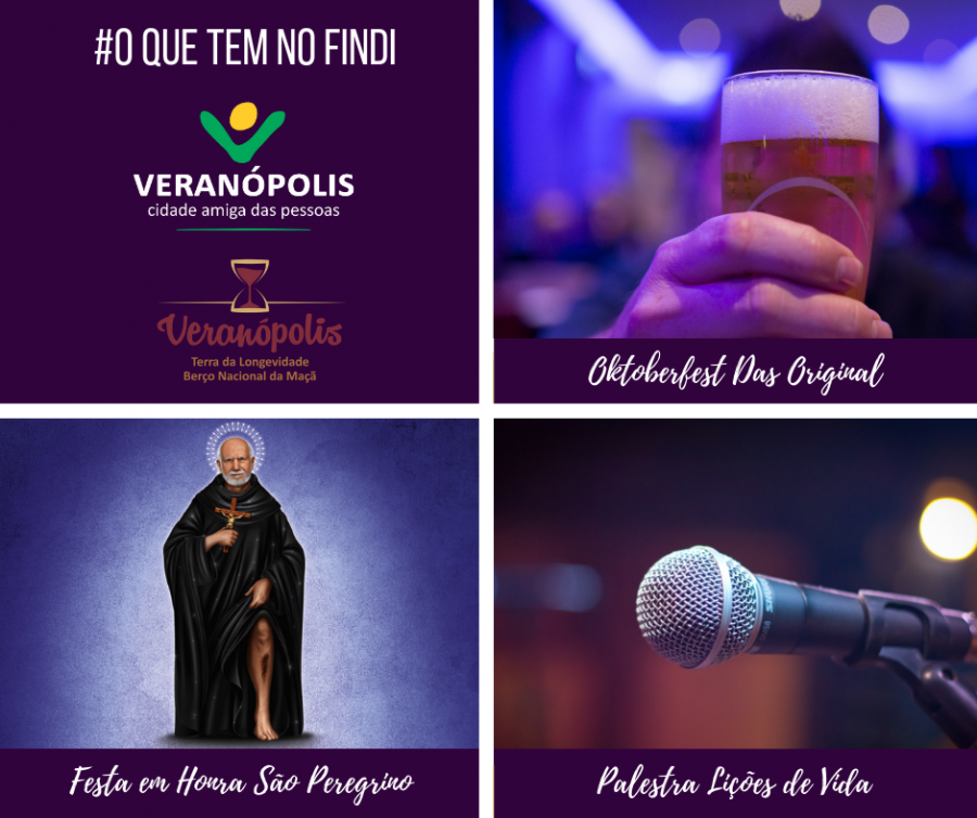 Confira a programação do final de semana em Veranópolis: Quinta 17/10 - 2º dia do Tríduo em Honra a N. Sra. da Pompéia - às 20h, na Capela de N. Sra. da Pompéia - Linha Parreira Horta. Celebração da Palavra a cargo da Comunidade de Vila Azul. Informações: Secretaria da Paróquia – (54) 3441-1604 - 1º dia do Tríduo em Honra a São Peregrino Lazziozi - às 20h, no Santuário de São Peregrino Lazziozi. Animação: Escola Virgínia Bernardi. Informações: Secretaria da Paróquia – (54) 3441-1604 - Acústico com Ronaldo Frizon - a partir das 23h, no Pepper’s Pub, BR 470 (térreo do Restaurante Giratório). Informações: (54) 99114-5093 Sexta 18/10 - Tai Acústico - abertura do bar às 18h30min, no Zeppelin Rock Bar, Av. Pinheiro Machado, 770. Informações: (54) 99654-3460 - 3º dia do Tríduo em Honra a N. Sra. da Pompéia - às 20h, na Capela de N. Sra. da Pompéia - Linha Parreira Horta. Celebração da Palavra a cargo da Comunidade de Nossa Senhora da Saúde. Informações: Secretaria da Paróquia – (54) 3441-1604 - 2º dia do Tríduo em Honra a São Peregrino Lazziozi - às 20h, no Santuário de São Peregrino Lazziozi. Animação: Catequese do Bairro. Informações: Secretaria da Paróquia – (54) 3441-1604 - Acústico com Frizon Brothers, no Boteco do Bode, Av Osvaldo Aranha, 1589. Informações: (54) 99990-7437 Sábado 19/10 - Campeonato Municipal de Futebol de Campo – Fase: Oitavas de final.No Campo do Planalto às14h: Cruzeiro x Planalto B, e às 16h: Planalto x Valverde No Campo do Ipiranga às 14h: Ipiranga x PJB Ipiranga e às 16h: Haliança x Serrano Em caso de chuva os jogos poderão ser cancelados. Maiores informações: Coordenação de Esportes – (54) 3441-1844. - Oktoberfest Das Original - às 12h, nos Pavilhões da Femaçã - Alameda Santos Dumont, 525. Informações: Altenbergg Cerveja Artesanal - (54) 99154-8439 - Jantar Dançante - às 20h, no Salão Menino Jesus de Praga – Renovação. Cardápio: Massa, galeto, maionese, saladas, pão e café. Realização: Lelo e Tita Boll e Estúdio Life Dance. - 3º dia do Tríduo em Honra a São Peregrino Lazziozi - às 20h, no Santuário de São Peregrino Lazziozi. Animação: Liga Feminina de Combate ao Câncer. Informações: Secretaria da Paróquia – (54) 3441-1604 - Festa Retrô - às 23h, no Clube dos Motoristas de Veranópolis. Informações: (54) 99624-3424 ou (54) 99677-0629 Domingo 20/10 - Festa em Honra a São Peregrino Lazziozi, no Salão do Bairro São Peregrino Lazziozi. 10h30min - Procissão saindo do Hospital São Peregrino Lazziozi até o Oratório. 10h45min - Missa Festiva 12h - Almoço e venda de churrasco e galeto. Durante o dia - Funcionará Tenda de Doces e Serviços de Copa. À tarde - Reunião Dançante animada pelo Pantera Negra. Informações: Secretaria da Paróquia – (54) 3441-1604 - Festa em honra N. Sra. da Pompéia, na Capela de N. Sra. da Pompéia - Linha Parreira Horta. 10h30min - Missa Festiva animada pelo grupo da Liturgia e Canto da Comunidade com a Coroação da Nossa Senhora. 12h - Almoço Festivo À tarde - Reunião Dançante Informações: Secretaria da Paróquia – (54) 3441-1604 E na próxima semana: Segunda 21/10 - Família Educa, Escola Ensina: Palestra Limites e Afetividade - às 19h, no Salão da Gruta Nossa Senhora de Lourdes, R. São Francisco de Assis – Centro. Palestrante/Escritor e Psicopedagogo: Gilson de Almeida Pereira. Informações: Secretaria Municipal de Desenvolvimento Social, Habilitação e Longevidade - (54) 3441-7242 - Palestra Lições de Vida - Otelio Drebes - às 19h30min, na Sociedade Alfredochavense (SOAL). Informações e vagas: Gabriela Sachini - (54) 98112-2515 / Jean Modelski - (54) 99672-8145 / GAIA Arquitetura - (54) 98421-2066 - Encerramento da 59ª Romaria de São Peregrino Lazziozi - às 19h30min, no Santuário de São Peregrino Lazziozi. Após a missa, tradicional Jantar com churrasco de ovelha. Informações: Secretaria da Paróquia – (54) 3441-1604 Diariamente - Casa Saretta - Centro de Atenção ao Turista BR 470, km 177, nº 2201. Informações: (54) 3441-5953 Segunda a sexta-feira das 8h30min às 17h Sábados e Domingos das 10h às 16h - Casa Saretta Artesanato BR 470, km 177, nº 2201. Informações: (54) 3441-7695 Segunda a sexta-feira das 8h30min às 11h30min e das 13h30min às 17h Sábados e Domingos das 10h às 16h De Segunda a Sexta-feira - Biblioteca Pública Mansueto Bernardi Av. Pinheiro Machado, 770 - centro (hall de entrada da SOAL). Informações: (54) 3441-7615 Segunda a sexta-feira das 8h30min às 17h Toda Quarta e Sábado - Feira Ecológica com agricultores de Veranópolis, no caramanchão ao lado do Salão N.S. de Lourdes: Quartas-feiras das 12h30min às 16 horas / Sábados das 07 às 12 horas Informações: Secretaria de Desenvolvimento Econômico: (54) 3441-1477