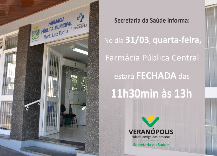 A Secretaria da Saúde informa que nesta quarta-feira, 31 de março, a Farmácia Pública Central estará fechada das 11h30min às 13h, devido a uma reunião interna de equipe. No restante dos dias os atendimentos seguem em horário normal.